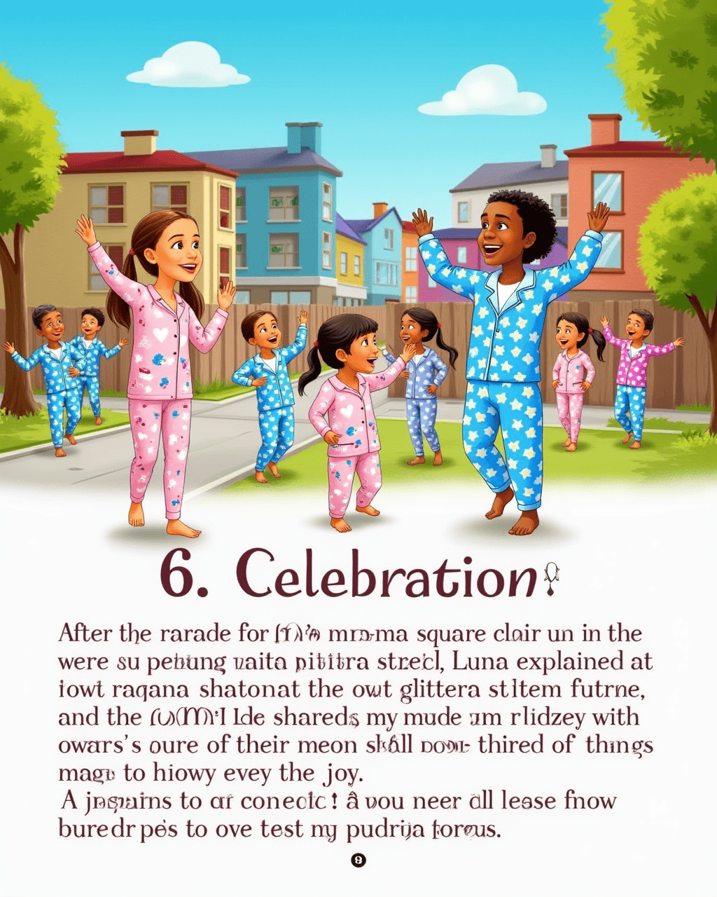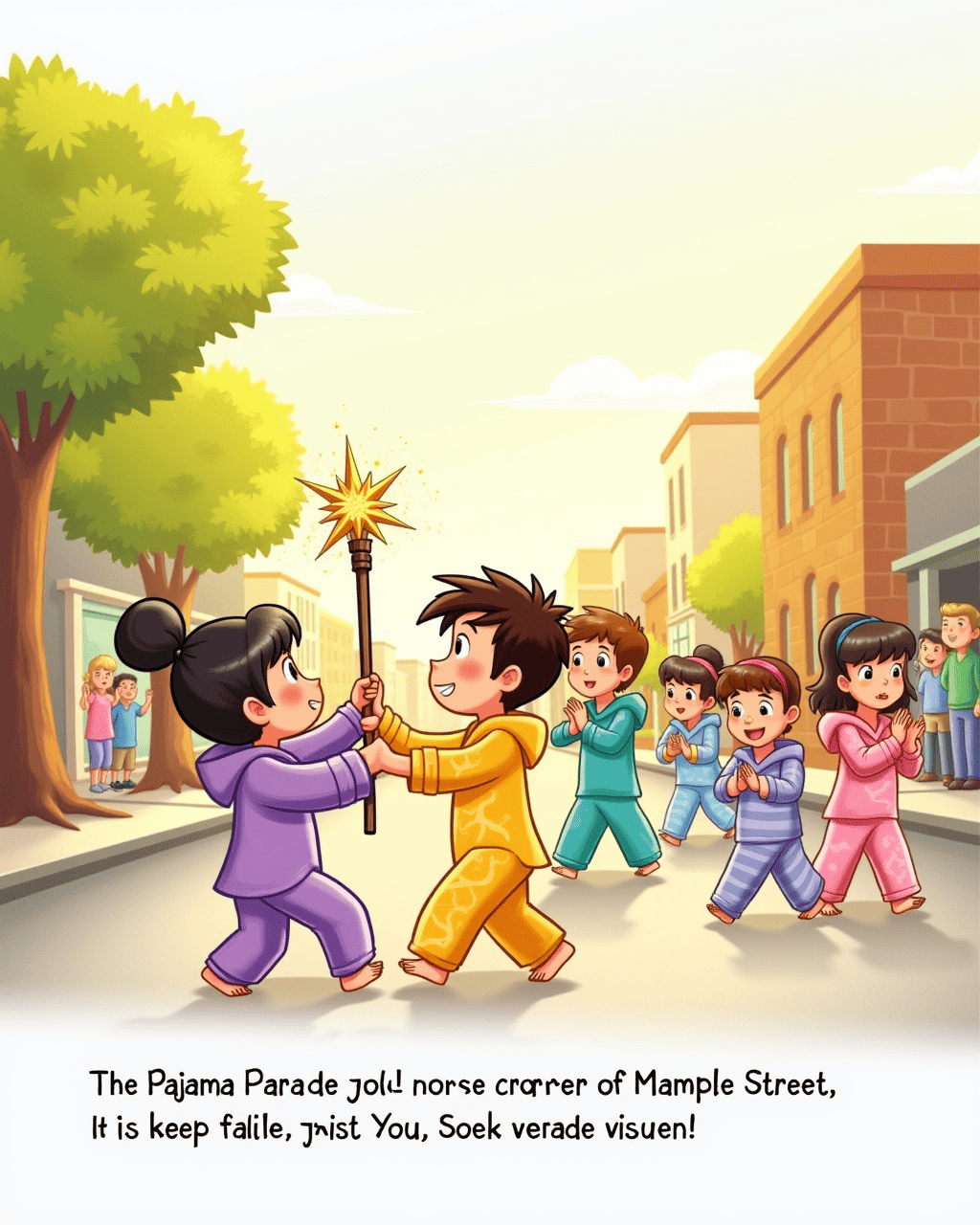 At the corner of Maple Street, the parade began with a burst of cheers. Luna waved a sparkly staff while Milo clapped his hands in sync. Children in bright pajamas marched following them, each step light and joyful. The parade route took them past the bakery, where the scent of freshly baked muffins drifted through the air. Kids applauded, and the sun painted the sky a warm golden hue.