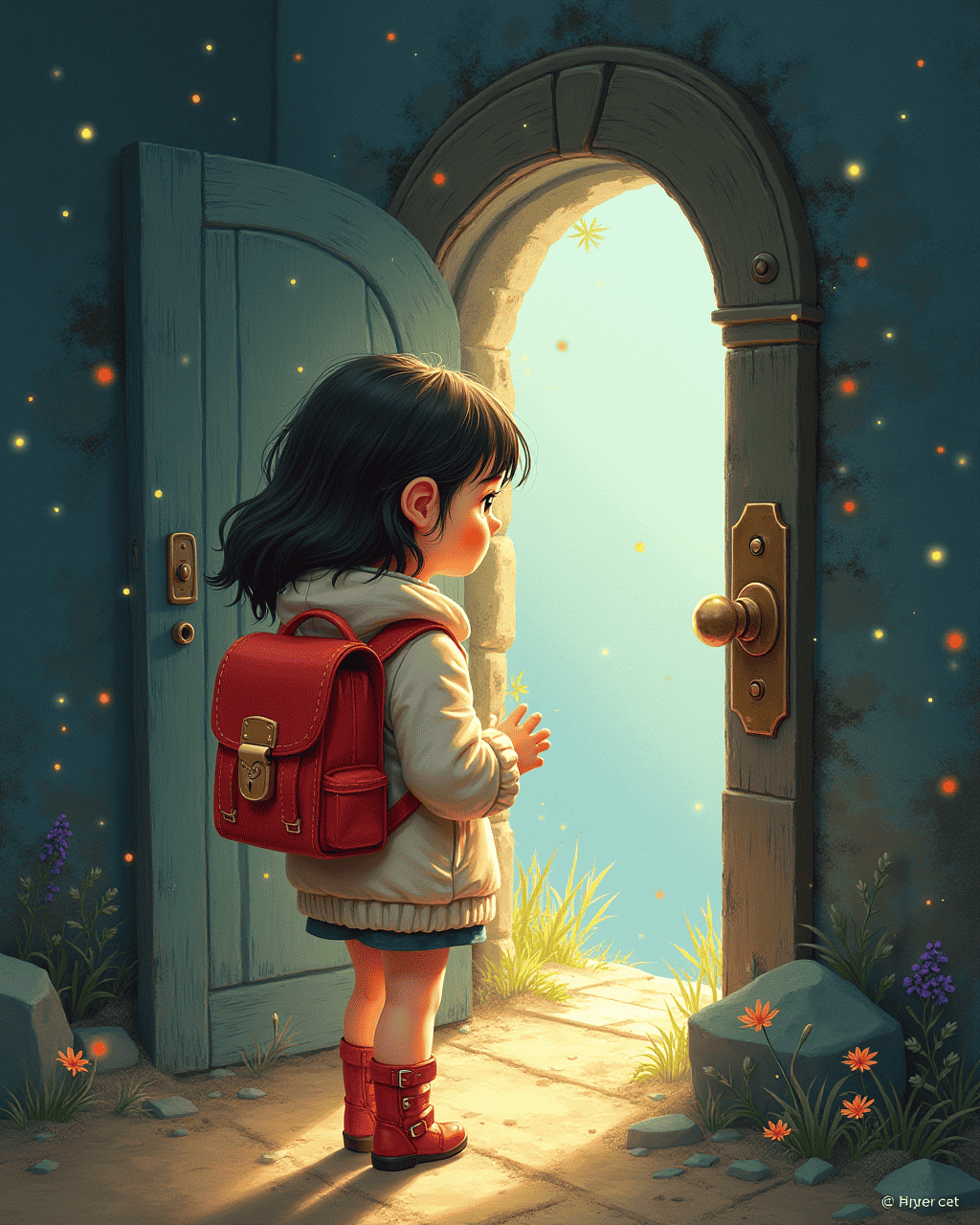 In a quiet town, a little girl named Lily loved exploring. She had a red backpack full of crayons and a map of her dreams. One rainy day, she followed a dusty trail behind the school. The trail led to an old door with a brass lock that glimmered in the light. Behind the door, the air smelled of adventure and saltwater. Lily pushed the door open and found herself standing in a dusty basement. The floor was covered with cobwebs, and a faint creak echoed through the room.