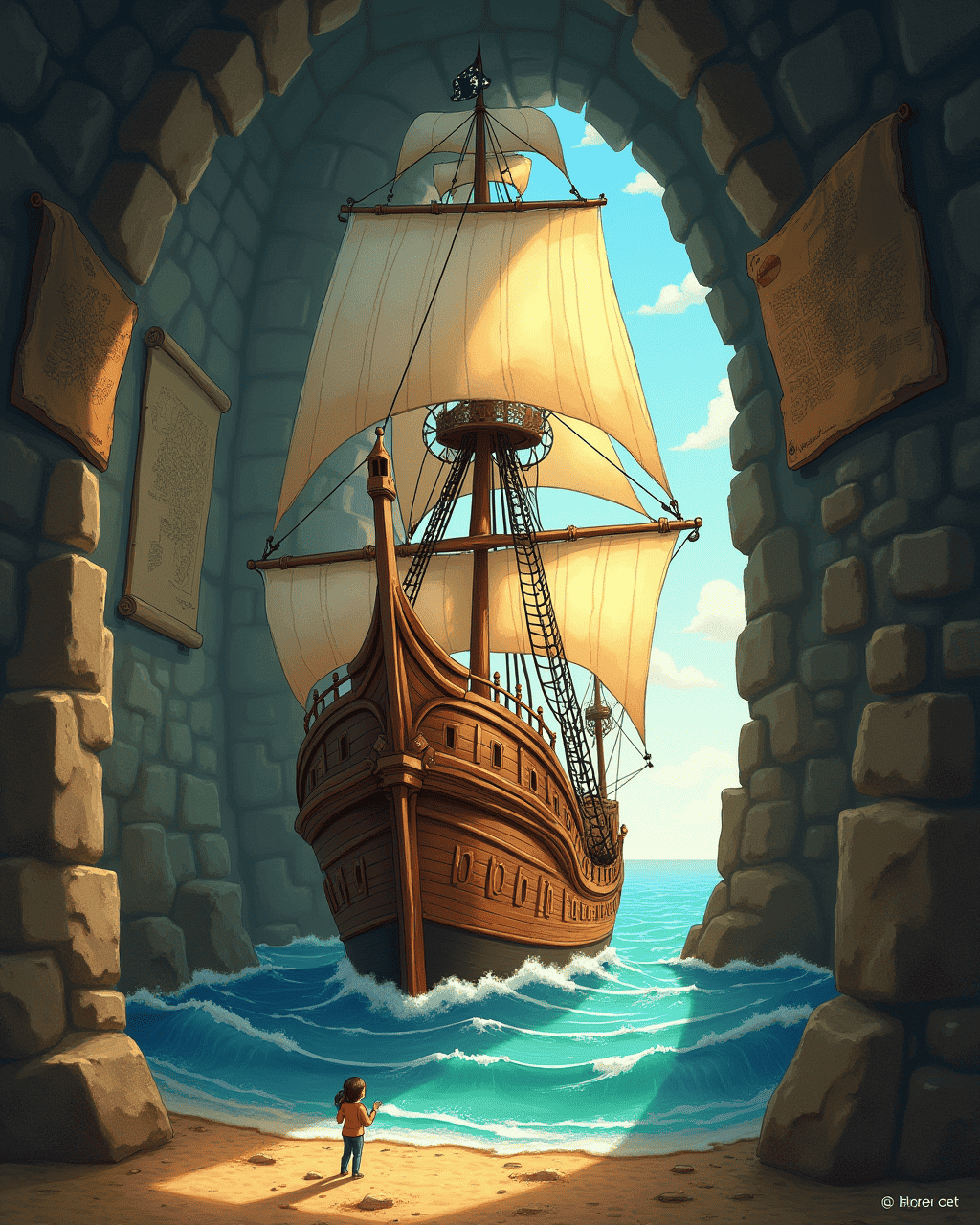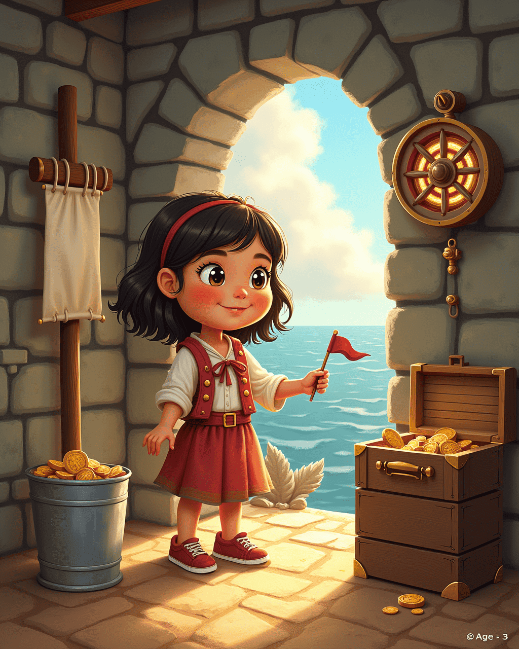 Inside the ship, everything was covered in a light dust of adventure. Old sails hung from the mast, and a brass compass glowed against a stone wall. Lily ran her finger along a silver brass bucket that might have once carried fresh water. A wooden crate sat beside a faded map of distant islands. She pulled the lid open and found a shining gold coin and a tiny pirate flag. The flag fluttered as if a breeze were blowing through the ship's narrow corridors.