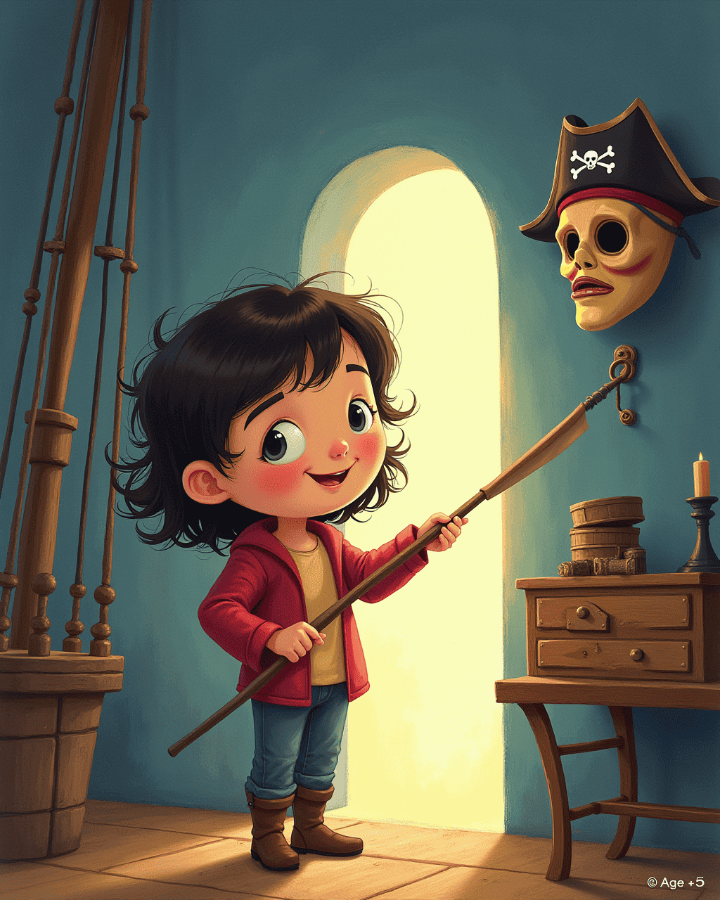 A sudden creak made Lily look up. Her eyes met a ghostly silhouette of a pirate's mask perched on a hook. The pirate's hat was tucked neatly beside a pair of brass goggles. Lily imagined the pirate's voice echoing through the ship, telling tales of treasure and adventure. She pulled the flag and pressed it against her chest, feeling the ship's old courage. Then a faint glow appeared in the corner of the ship, revealing a hidden passage.