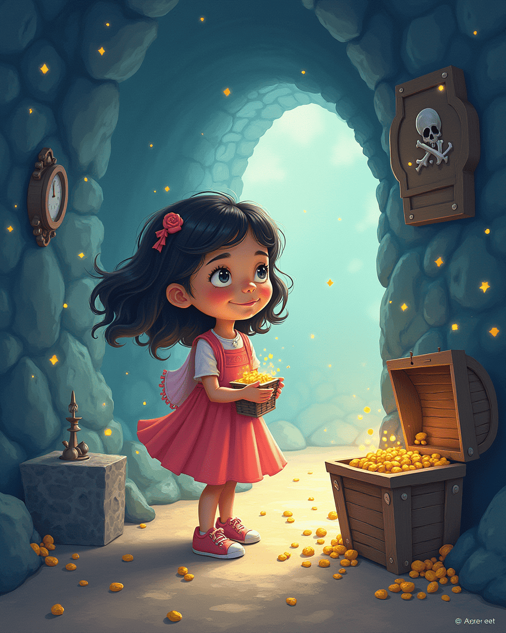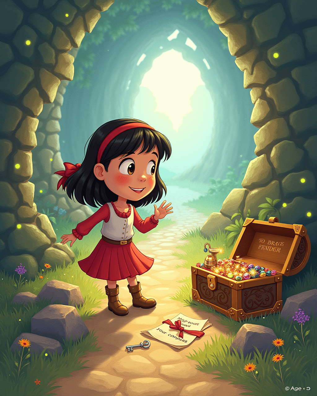 She followed the glimmering path and found a chest carved with intricate designs. The lock was heavy, and the key she found earlier fit the hinges with a satisfying click. The chest creaked open, revealing a bundle of twinkling jewels and an ancient letter. On the letter, a faded ribbon said, "To the brave finder, May your courage be your compass." Lily whispered the words, feeling the adventure grow inside her like a tiny ship on the high sea.