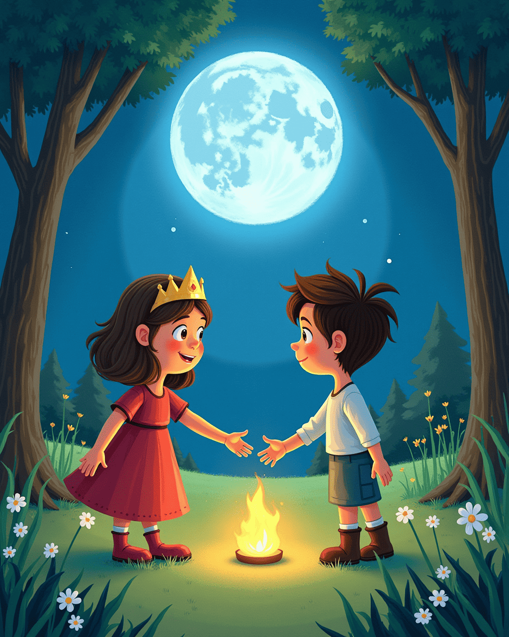 One moonlit night, Liora slipped out of her chambers. She met her friend Milo, the clever shepherd boy, in the whispering woods. Milo confessed that he had a dream of becoming the kingdom’s best farmer, not a prince. Liora listened and understood that everyone’s path is unique. She decided to share her secret with the king.