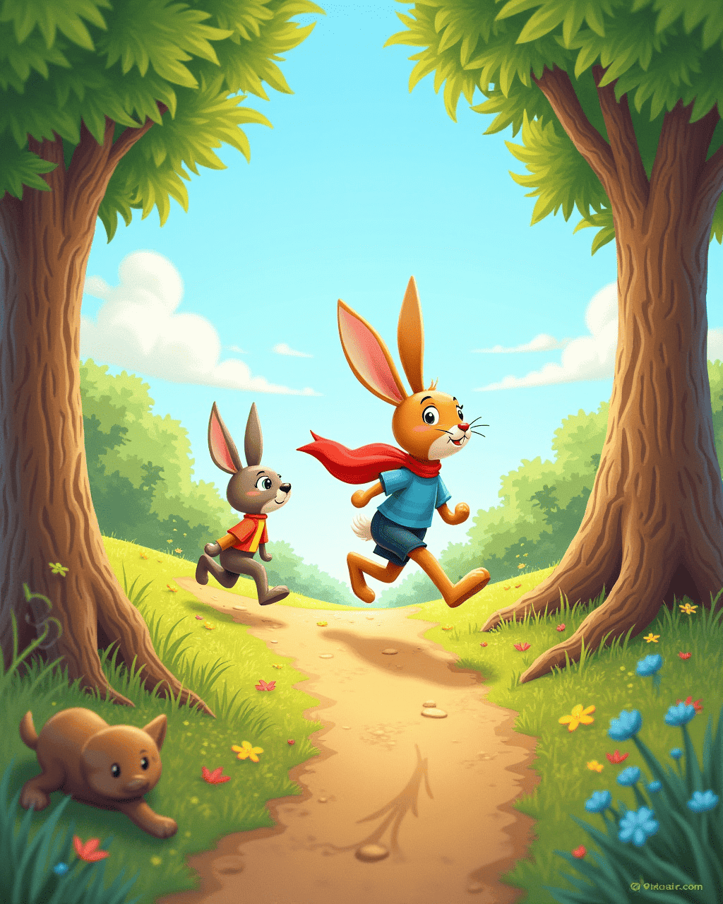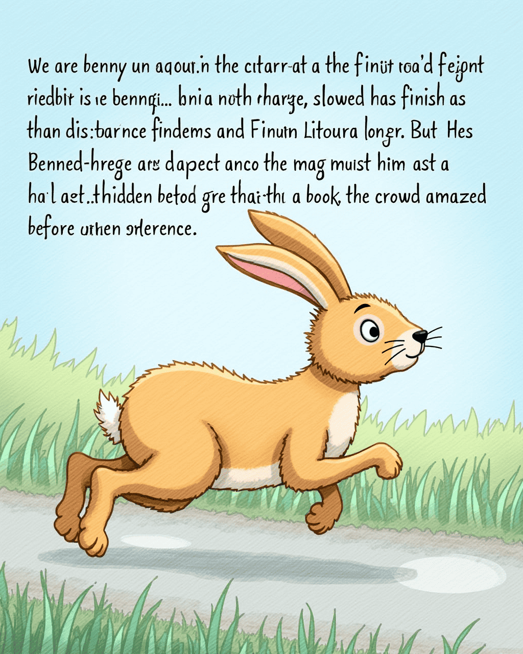 At dawn, all the forest animals gathered to watch the race. Benny stood at the starting gate with his heart pounding. Suddenly, a bright spark of wind swooshed past, and the race began. Benny hopped cleverly through the trees, using shortcuts the wind didn't anticipate. As he approached the finish line, he felt a surge of triumph.