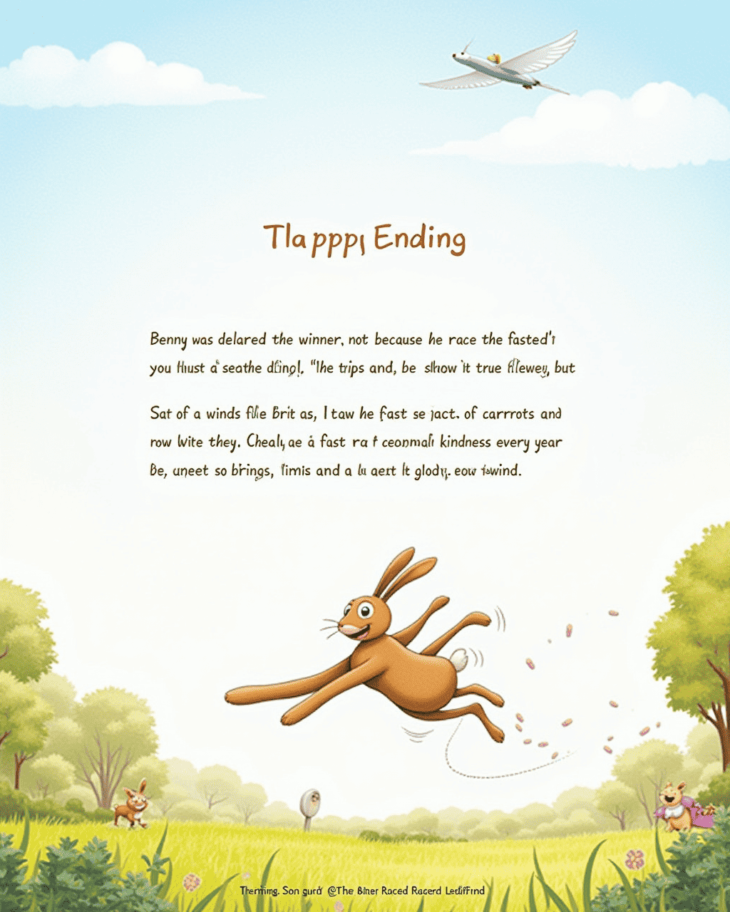 Benny was declared the winner, not because he was the fastest, but because he stayed steady and clever. The wind bowed in respect, saying, "You have shown true courage." Benny and his friends celebrated with a feast of carrots, nuts, and sweet berries. They all cheered for Benny and promised to race with kindness every year. And so, the Rabbit Who Raced the Wind became a beloved legend in the meadow.