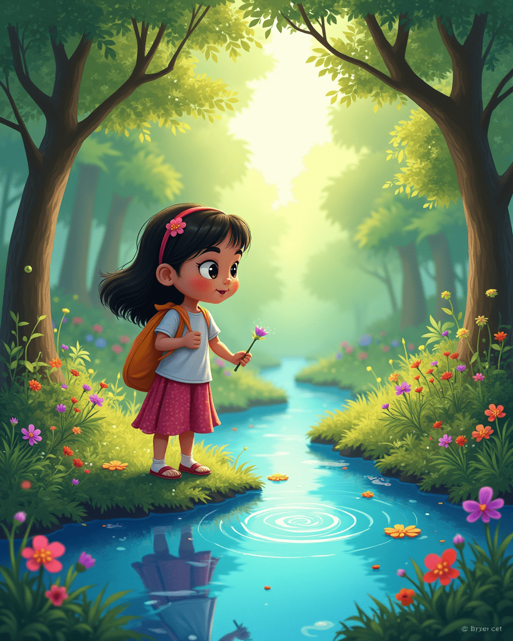Mira, a curious little girl, loved to explore the forest near her home. One bright morning she spotted a shimmering ripple in the brook. Instead of water, it glowed with soft blue. She touched the cool mist and felt a gentle hum. The glow grew brighter, turning the whole river into a living canvas.