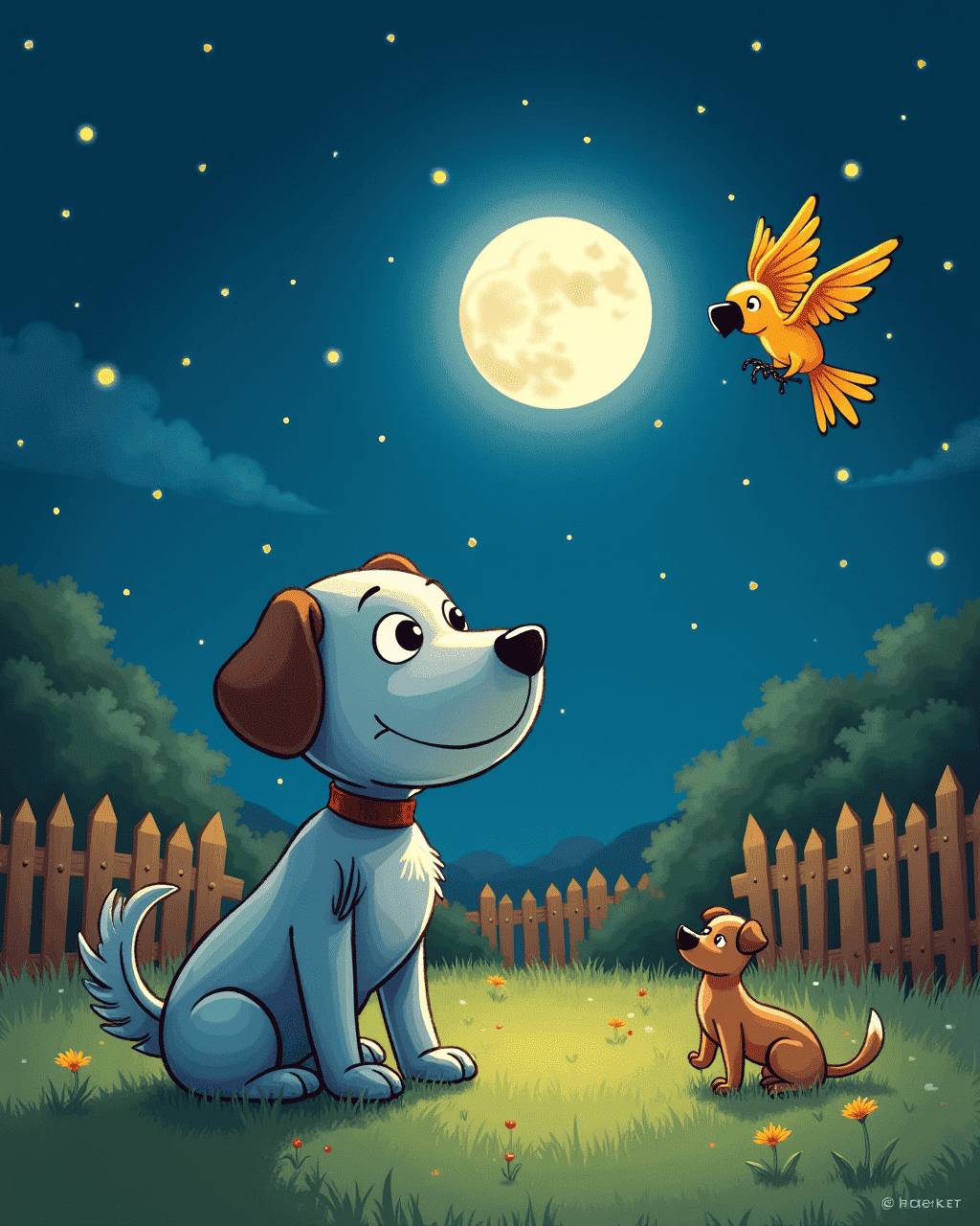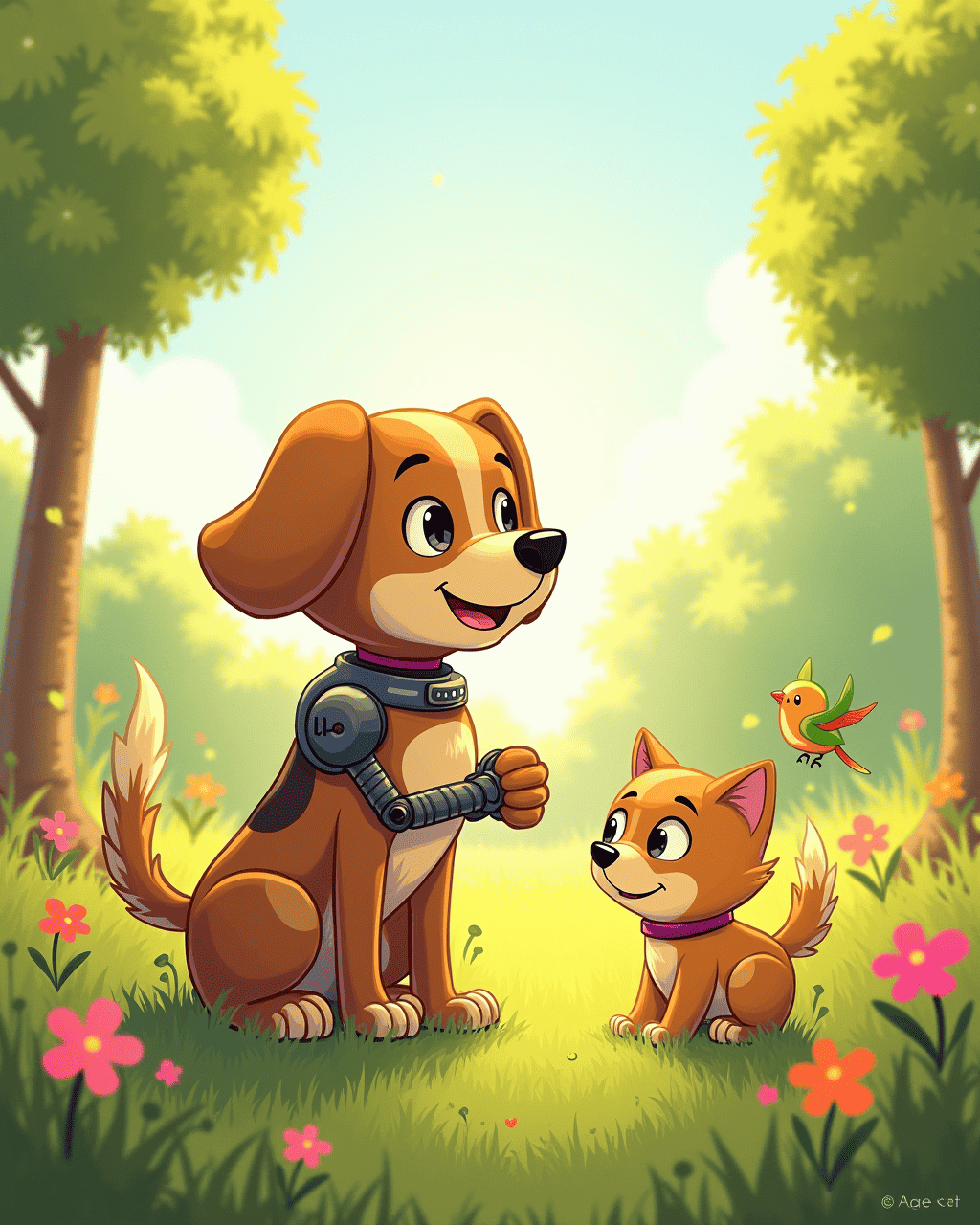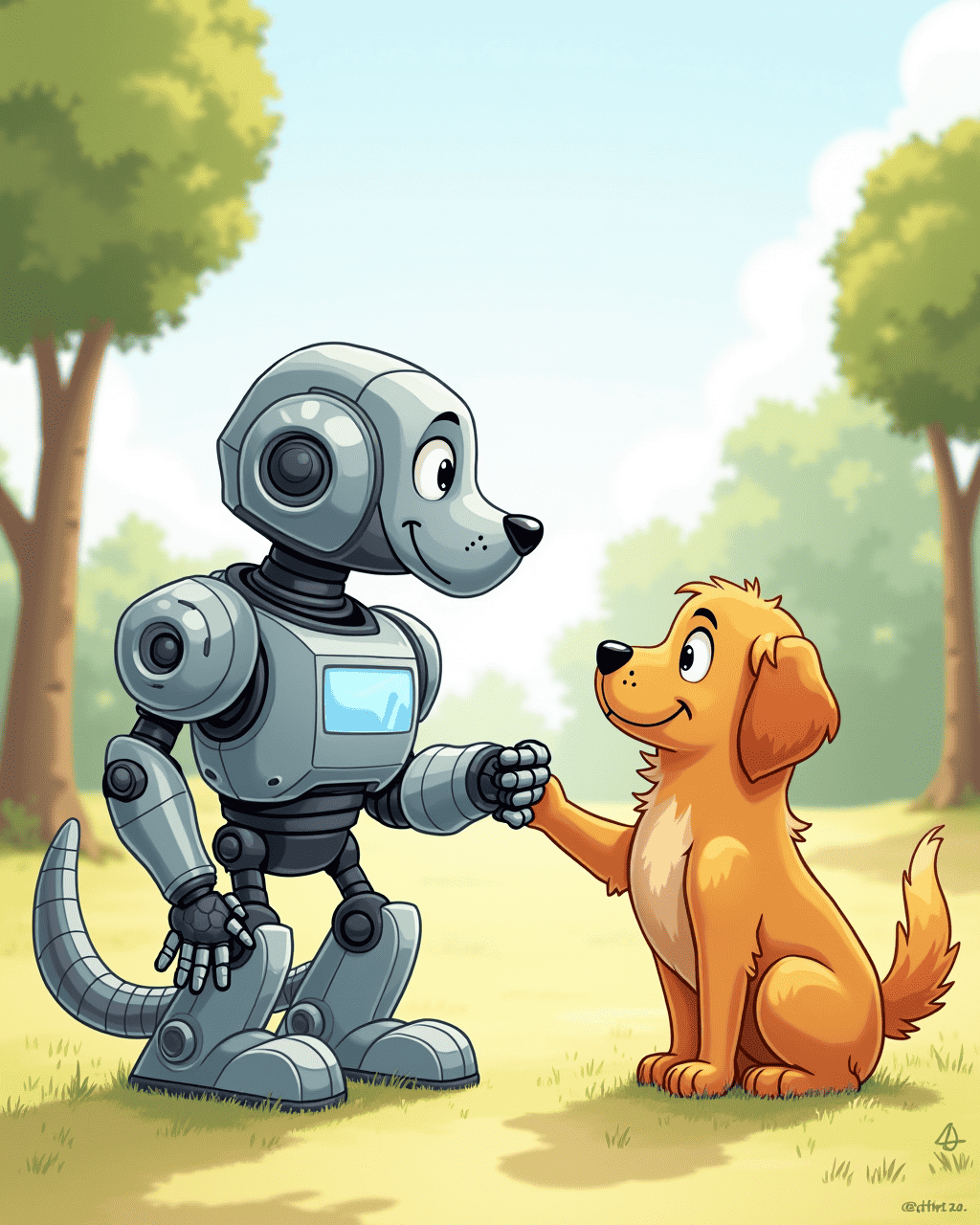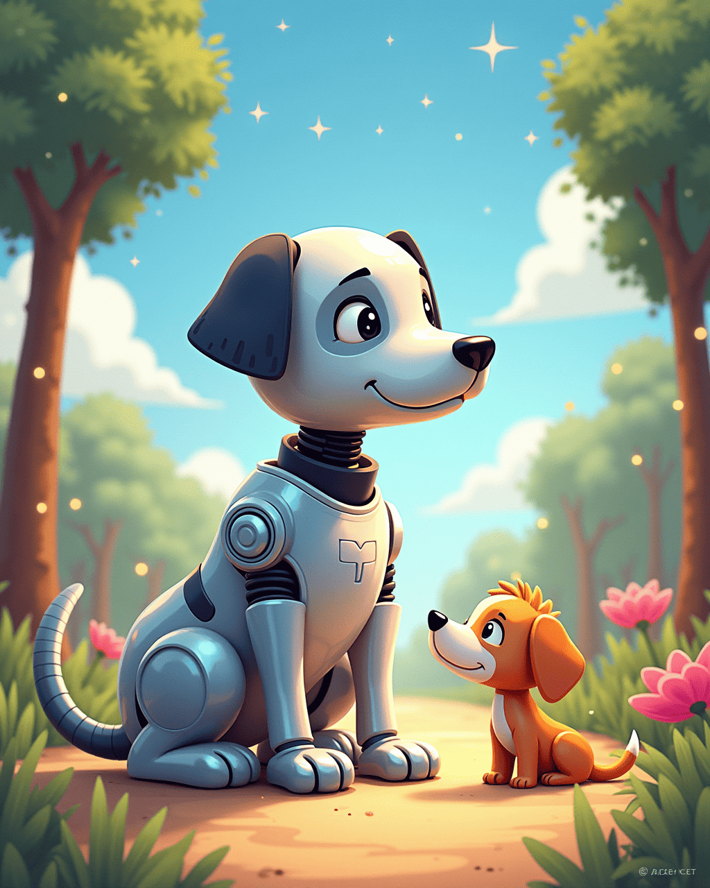Botley the robot dog lived in a bright little workshop on the edge of the town. He was made of shiny chrome, with bright LED eyes and a soft rubber belly. Even though he was built to be playful, Botley hid in a corner whenever the town’s park dogs ran by. He was afraid of their wagging tails and loud barks. Every night, he dreamt of making friends, but his metallic heart trembled in fear.