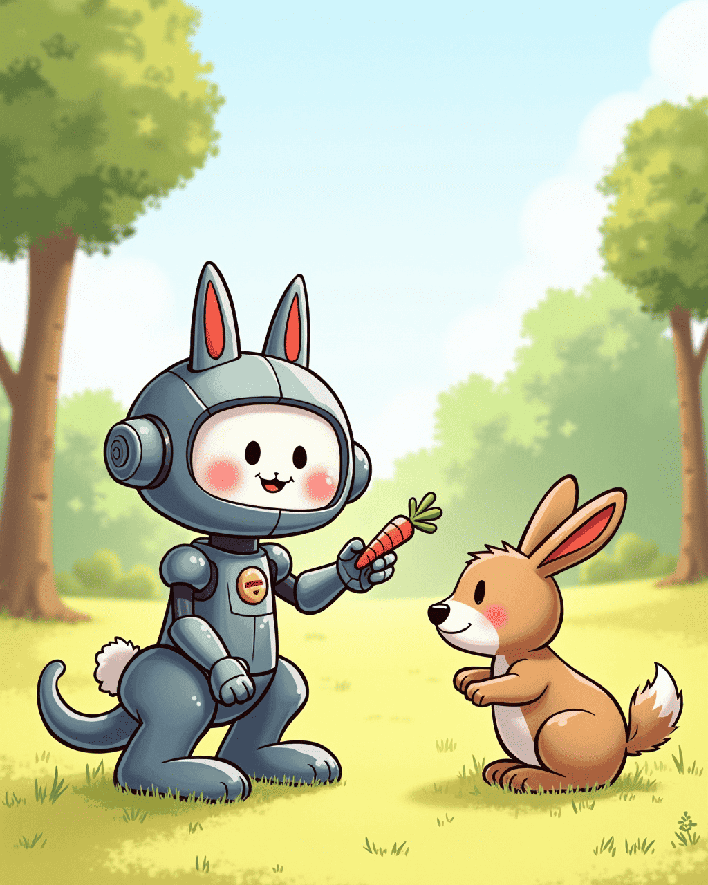 The next day, a shy rabbit brought a basket of carrots to the town square. It had never seen a robot dog before. Botley politely introduced himself, and the rabbit nodded, saying, "I do not fear you because I see that you are kind." Botley felt a new wave of courage. He realized that fear is often just a guess about what could be, and if it turns out different, the guess was wrong.