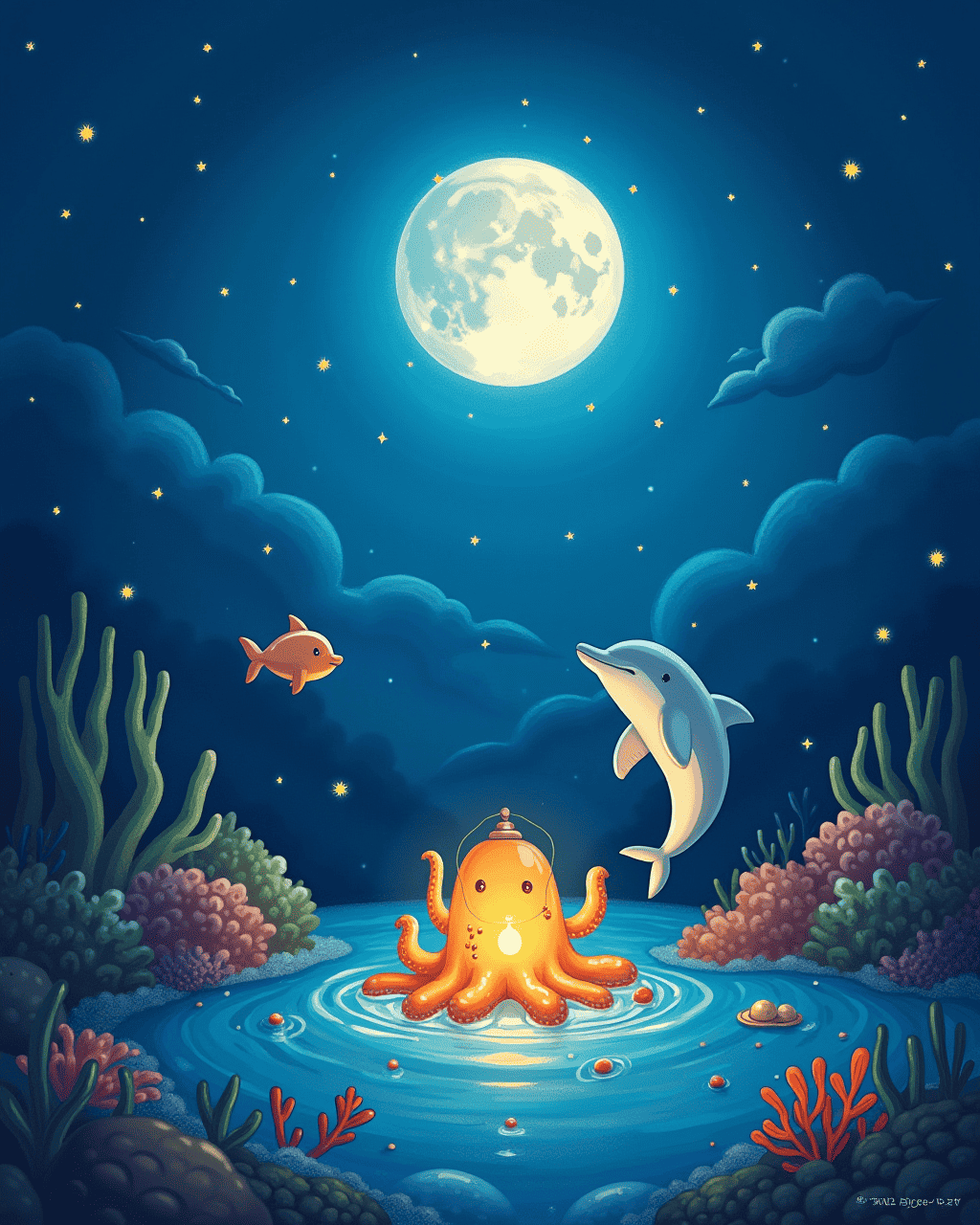 Near the reef, a shy octopus named Opal swam beside them. She showed them how to hide when they felt scared. A playful dolphin named Daisy danced around the lantern. Together, they laughed and sang under the moonlit waves. The sea turned into a stage for their joyous game.