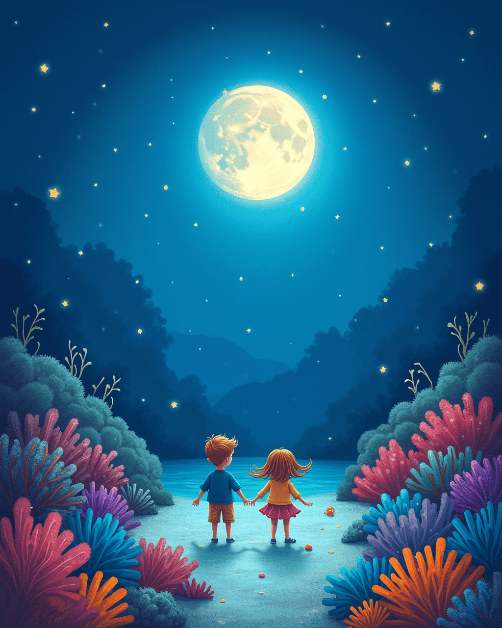 Mia and Leo followed the lantern’s glow to the heart of the reef. They saw a shimmering gate made of pearl and silver. Inside, a crystal rose from the sand, shining like a star. Their heartbeats matched the rhythm of the sea. They knew the secret of the silent sea was a treasure of friendship.