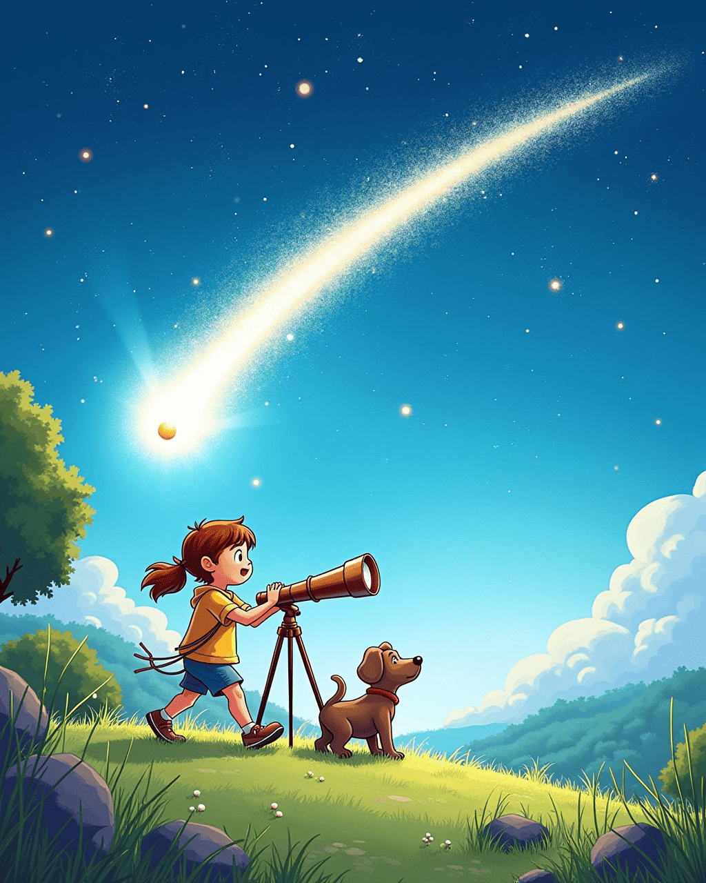 The comet streaked across the sky, leaving a glittering trail. Milo wagged his tail, excited by the sight. Lila followed with her telescope, tracing the comet’s path. When the comet paused, its eye glowed warmly, inviting them to a hidden place. A voice came from the darkness, saying, "Come, follow the music."