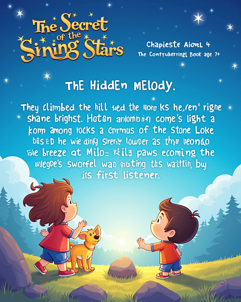 They climbed the hill where the comet’s light shone brightest. Hidden among rocks sang a chorus of glimmering notes. Lila pressed her ear to the stone, and the melody grew louder, swirling like a breeze. Milo’s paws tapped in rhythm, echoing the song’s playful beat. The secret of the singing stars was waiting for its first listener.
