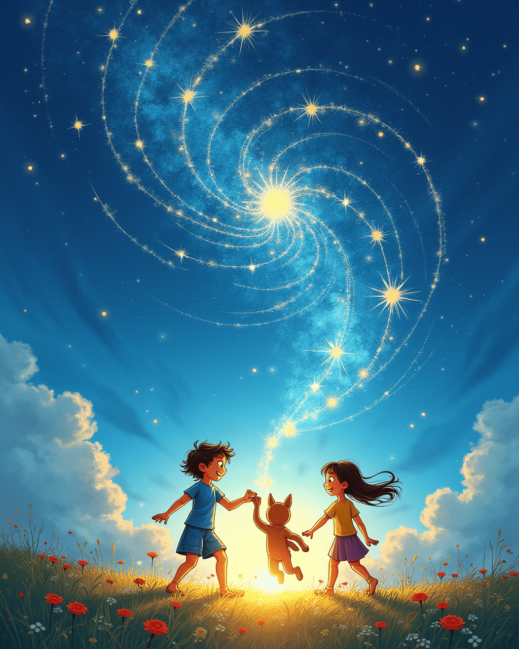 Every star in the sky began to move, twirling in endless spirals. Lila felt her heart beat like a drum, synchronized with the starlight. Milo leapt through a ring of falling sparks, his ears fluttering. The stars spun faster, forming a magnificent glittering dance. The world felt full, as every voice joined in harmony.