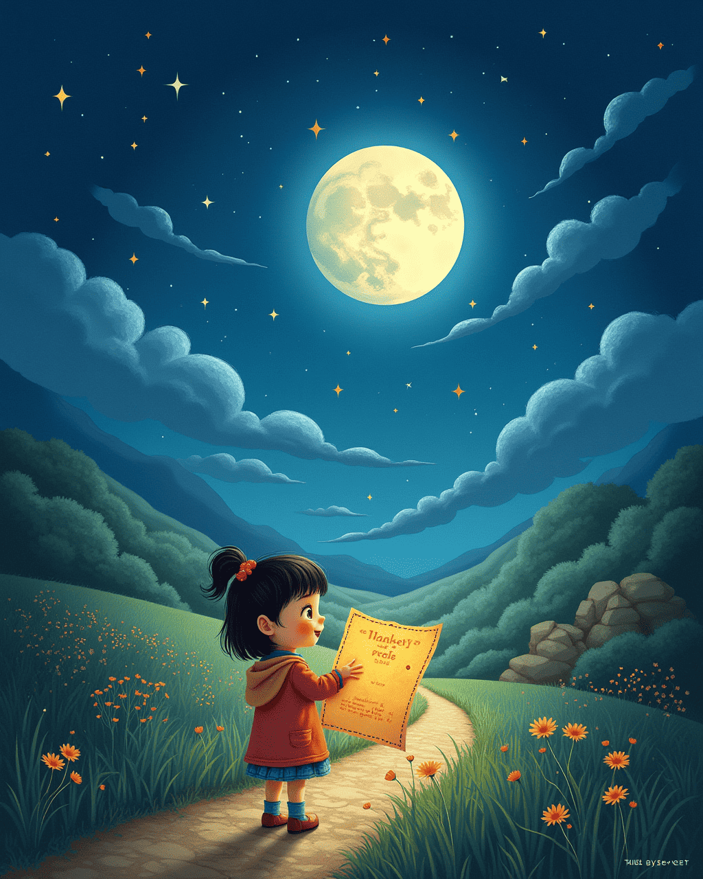 While cleaning the attic, Maya found an old, faded paper. A picture of a sky with strange lines stitched across it. She traced the lines with her finger as if following a road. The map promised a hidden path to the heart of the sky. With her courage, Maya set out beneath the moonlight.