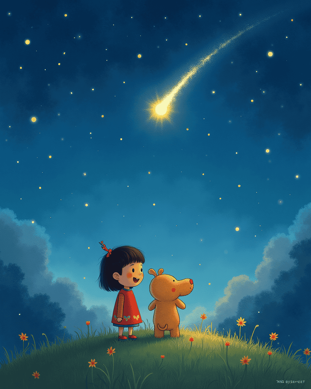 The next night, a bright comet streaked across the evening sky, leaving a glowing tail. Maya watched and felt a gentle pull toward the comet. She followed the tail, and it guided her to a small hill behind the village. There, a silver light sang softly: Continue, brave heart. Maya felt the stars singing her name.