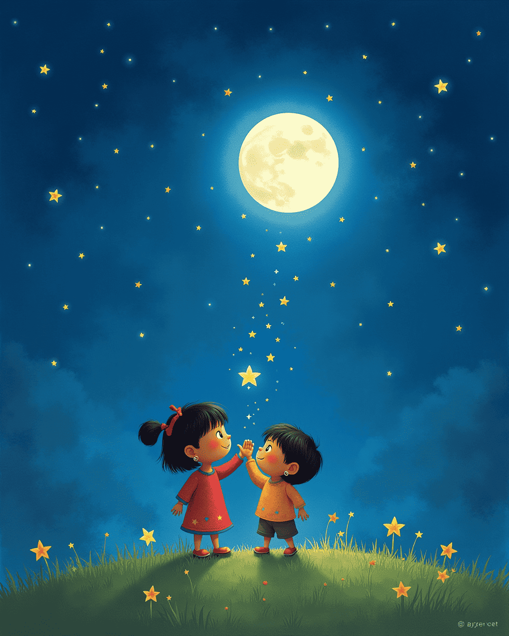 Finally, the stars led Maya to a clearing where the moon shone the brightest. There was one last, missing star—a glowing blue dot. Maya reached out, and the star joined the others, completing the sky's tapestry. The sky sang a lullaby of hope and friendship. Each star nodded in approval, as if welcoming all children.