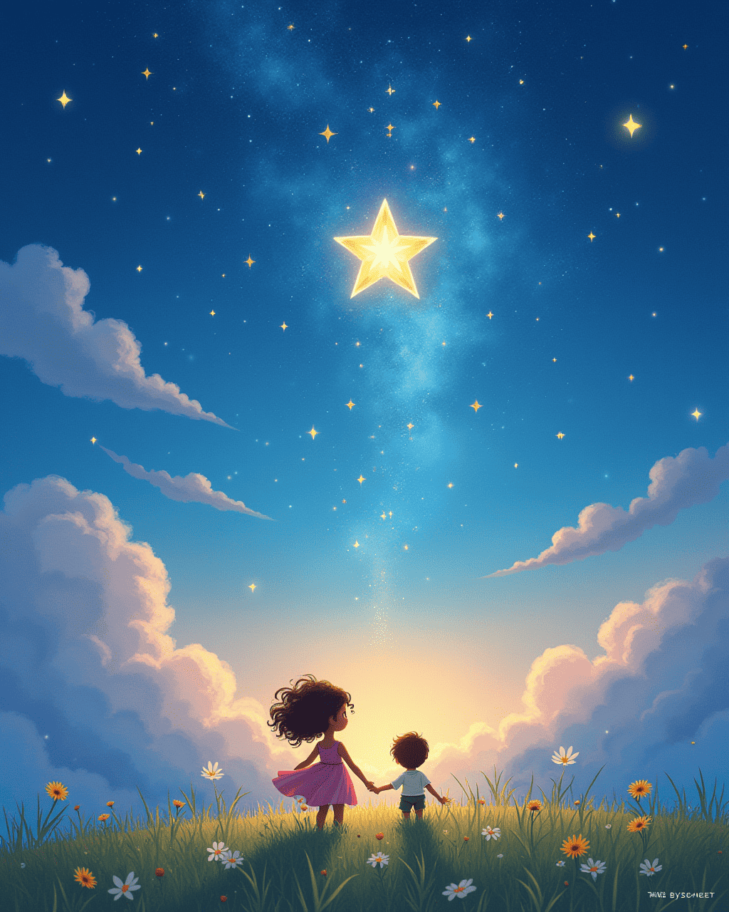 When the children looked up that night, they saw a beautiful scene of stitched stars. Maya returned home with a smile and shared her adventure with her friends. The sky promised I will always guard the dreams of brave children. From that day, everyone in Lumin believed the stars would guide them to wonder. And so, the secret of the star‑stitched sky lives on in every night’s wonder.