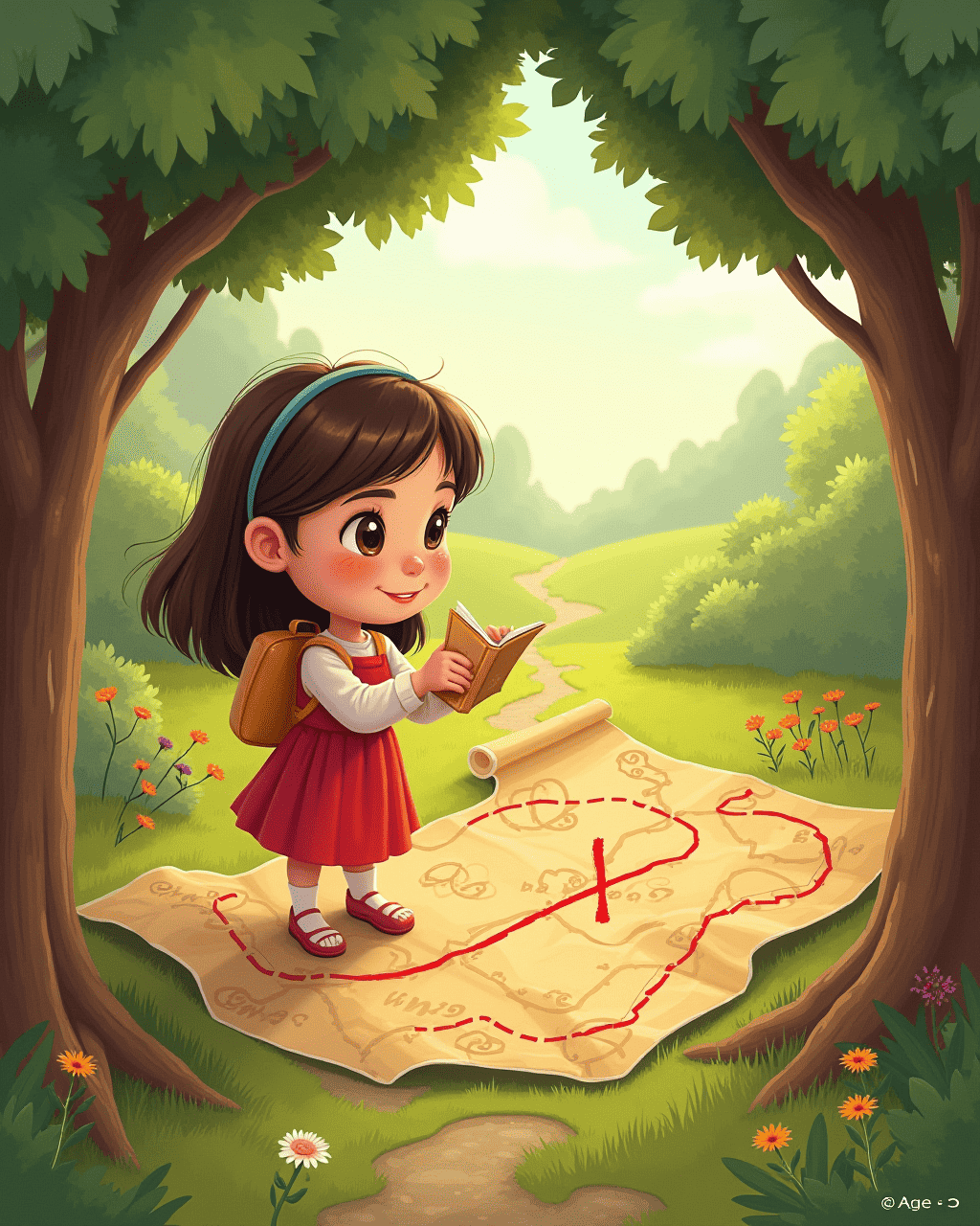 Lily found an old map tucked in her grandmother’s attic. The map was yellowed but still bright with a big X drawn in red. She traced the path with her finger and giggled. Her grandmother whispered, “That X marks something very sweet.” Lily promised to find it and follow the trail to see the secret.