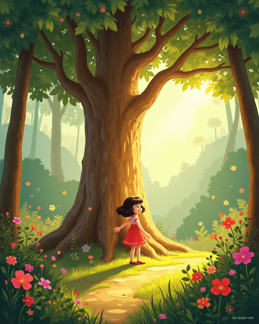 Every year, the villagers meet at the tree and share sweet stories. They build a big circle and let the sunshine glitter on the tree’s bark. They say, “The sweetness of kindness lasts forever.” Lily keeps the map safe, hoping one day another child will discover the next secret.