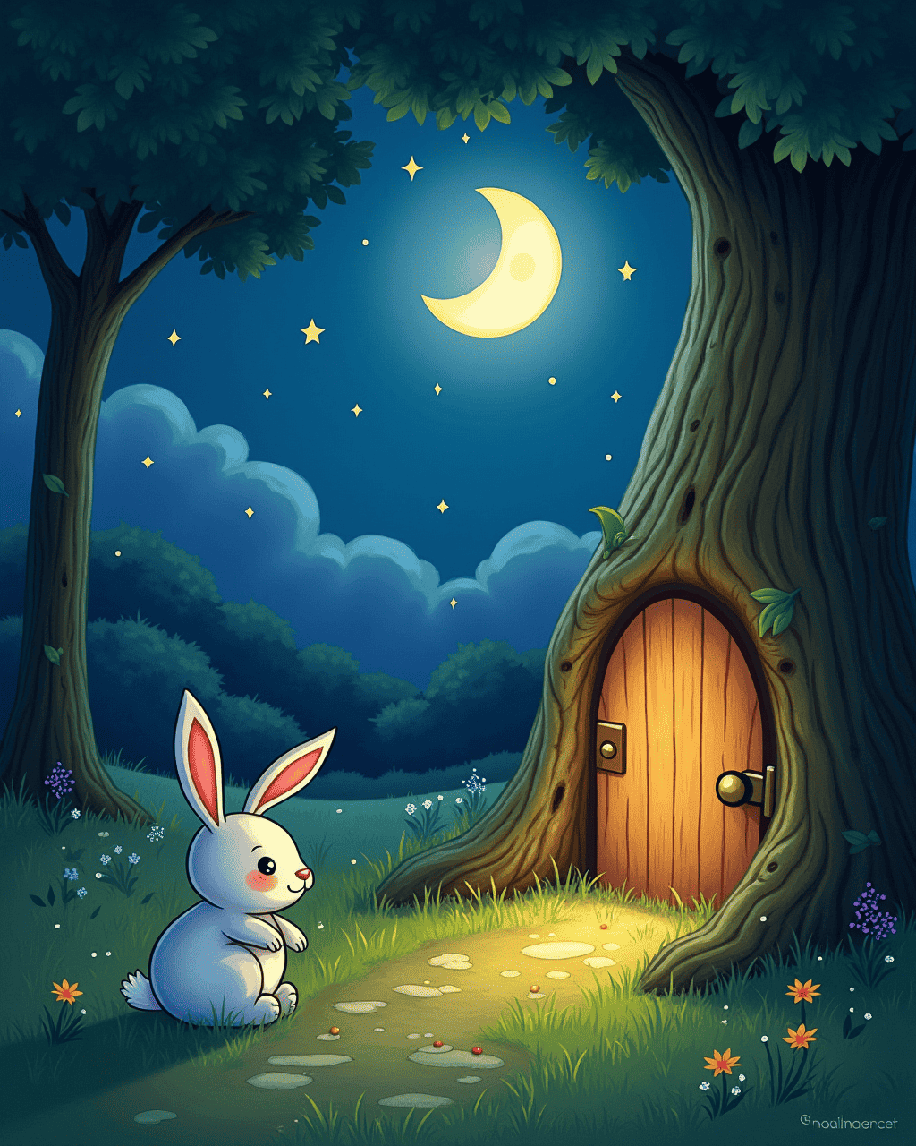 While exploring, a shy rabbit hopped beside her. The rabbit’s ears were twitching, and it followed Lily toward a hidden clearing. In the clearing, Lily discovered a wooden door carved in the trunk. The rabbit nudged the door; a door that opened easily as if waiting for her. The room inside was filled with bright beads that shone like stars.