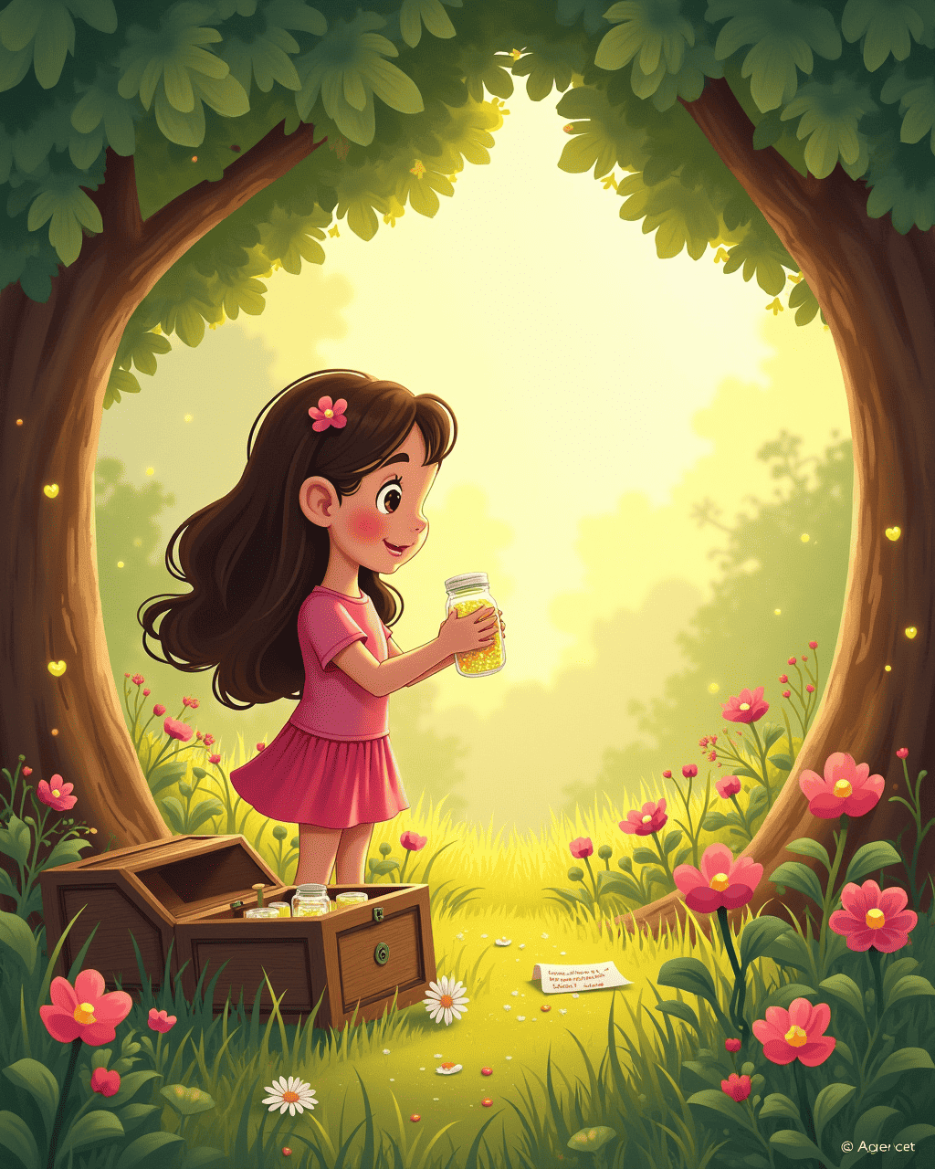 Inside the tree, Lily found a chest. She opened it and watched light spill out like warm sunshine. The chest held jars of glittering liquid, and a note that said, “For those who believe in sweetness.” Lily poured a droplet into her cupped hands, and it tasted like pure joy. She tasted the secret and felt love all around.