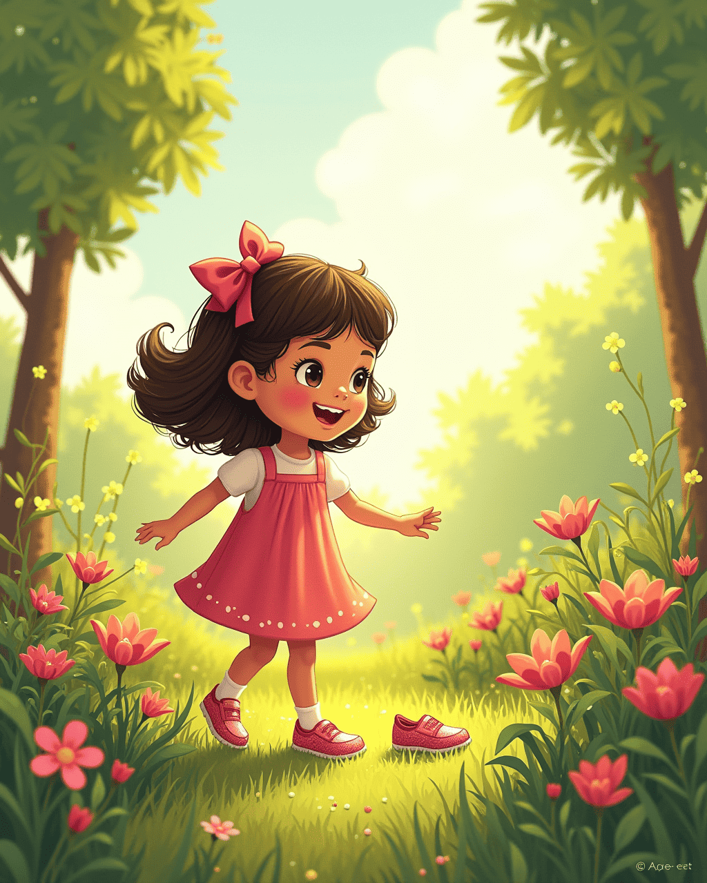 Kiki was walking in the garden when she spotted a tiny, glittering shoe lying among the flowers. She picked it up, and it felt warm and alive in her hand. Curiosity tickled her as she slipped the shoe onto her foot. Suddenly, the shoe began to hum softly, as if it was whispering a secret. Kiki giggled, wondering what adventures this strange shoe would bring.