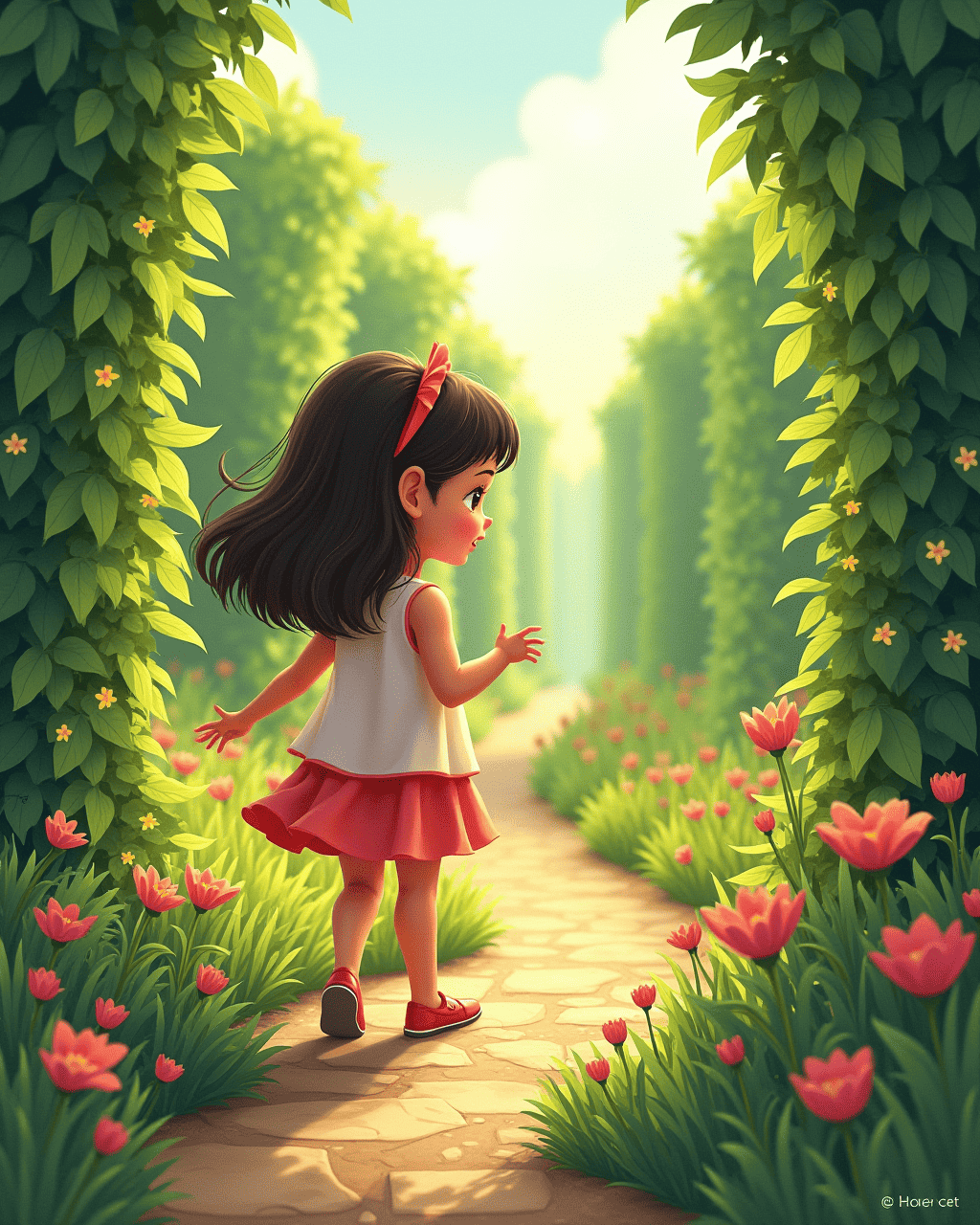 The shoes guided Kiki through the winding maze, pointing out hidden paths that only they could see. Each step left a bright starprint that glowed on the stone, reminding Kiki of where she’d been. The shoes recalled the smell of fresh grass and the chatter of friendly sparrows. Kiki laughed with delight as the shoes danced beneath her feet. She felt the magic grow stronger with each memory.