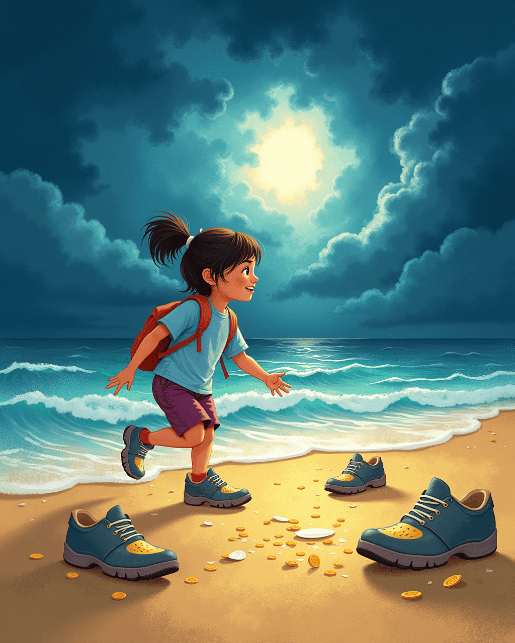 At the far end of the beach, the shoes showed Kiki a secret cove where treasure chests glimmered in the sand. They remembered the salty wind, the rhythmic waves, and a mischievous dolphin that played hide-and-seek. Together with Leo, Kiki uncovered a chest filled with sparkling shells and shiny coins. The shoes tickled with laughter, echoing the joy of the moment. They walked home with the tide kissing their toes.
