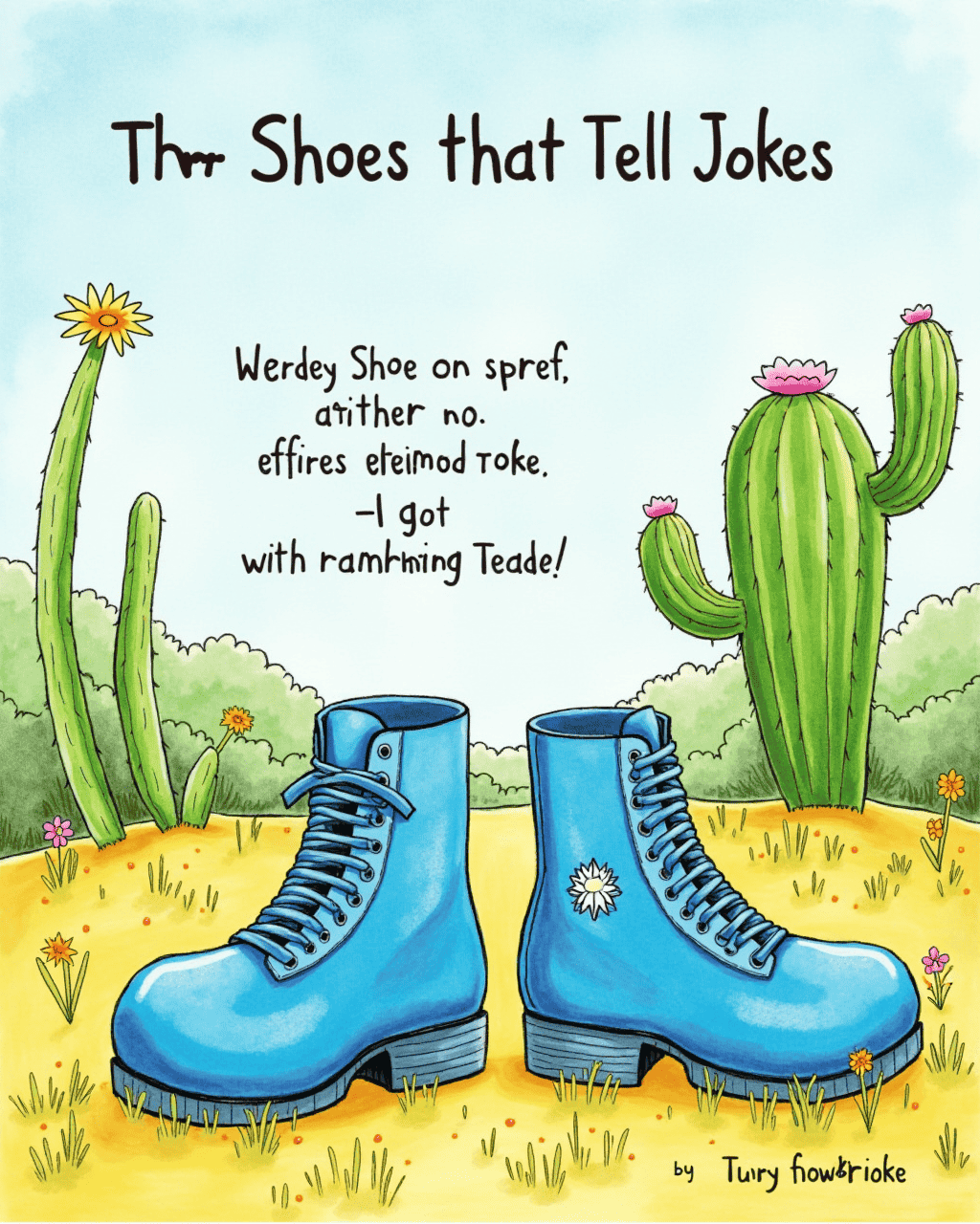 In the quiet town of Willowbrook, there were two bright blue shoes that had an unusual secret. Whenever someone stepped on them, a cheerful giggle echoed from inside the sole. The shoes, named Jolly Steps and Chuckling Treads, loved nothing more than making people smile. They waited every morning for their owner, Miss Lily, to put them on. When Lily slipped them on, the shoes would whisper a joke that could brighten even the gloomiest day.