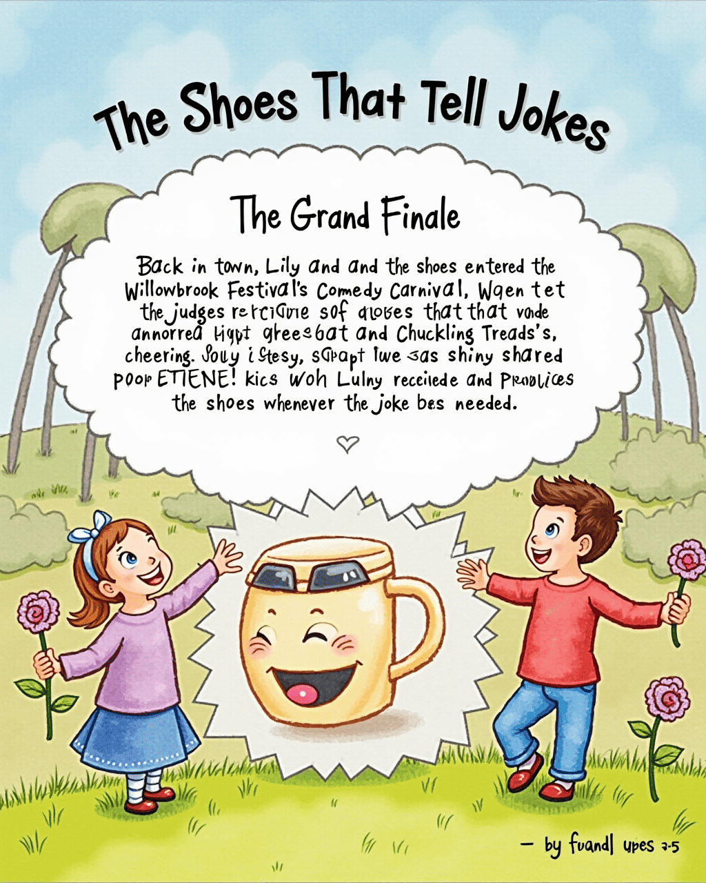 Back in town, Lily and the shoes entered the Willowbrook Festival’s Comedy Carnival. The duo performed a routine of jokes that had everyone cheering. When the judges announced the winner, it was Jolly Steps and Chuckling Treads! They received a shiny trophy shaped like a laughing cartoon shoe. Lily carried them proudly, and everyone promised to visit the shoes whenever a joke was needed.