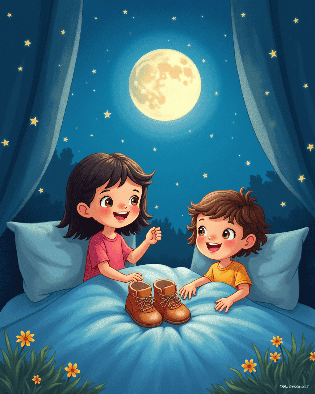 Night fell over Willowbrook, and the shoes whispered to Lily, "Tomorrow, we’ll go to the next town, and the jokes will keep spreading happiness." Lily smiled and tucked the shoes into her bed, knowing tomorrow held new adventures. The shoes twitched their soles, ready to step into a new day full of giggles.
