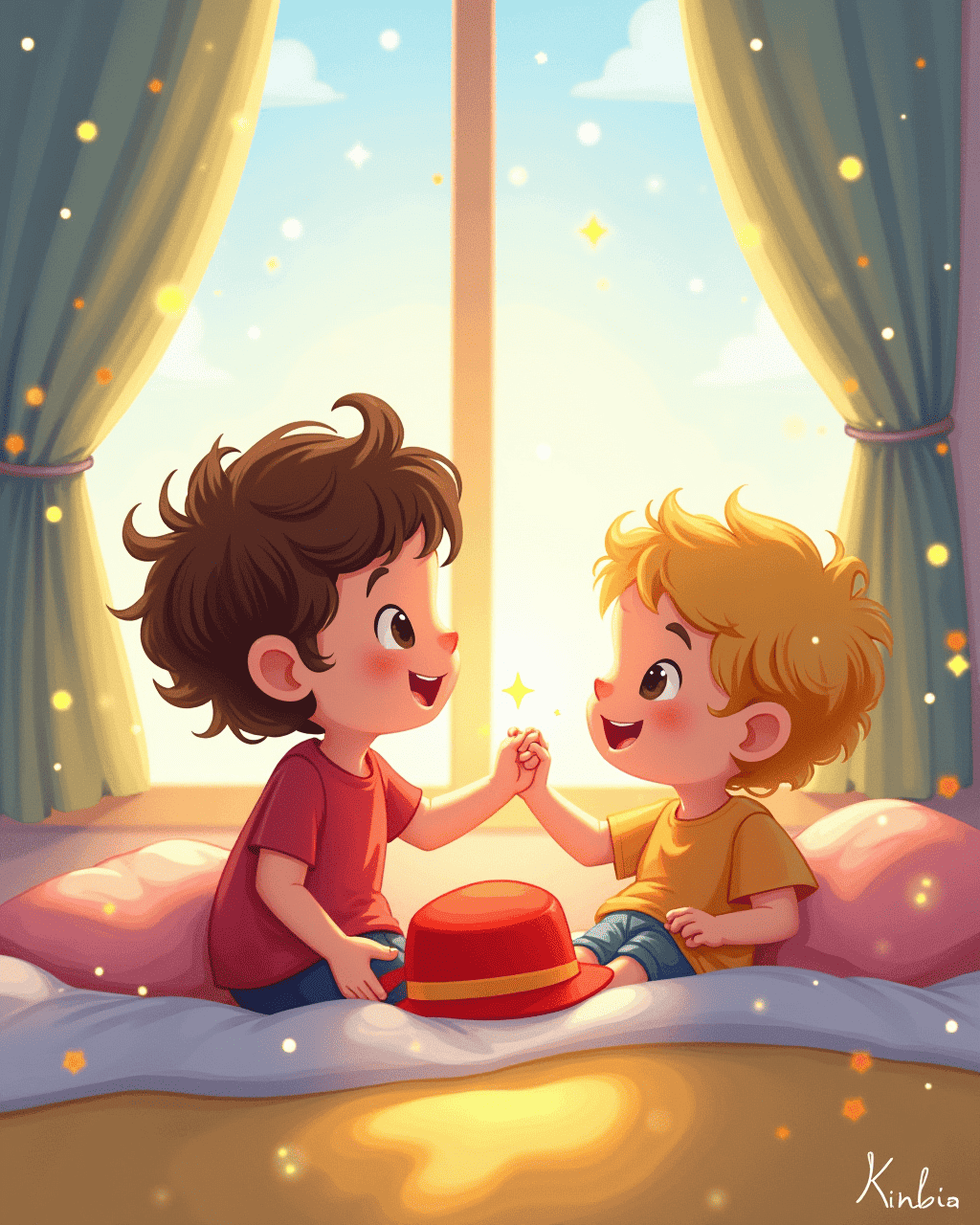 Sam woke up bright and early, the sun peeking through his curtains. He found a bright red hat on his pillow and wondered who had left it. Curious, he tucked it into his backpack. Lily, hearing a strange clink, peeked into Sam's room. They both giggled, feeling the promise of an adventure. Together, they decided to start the day with the hat.