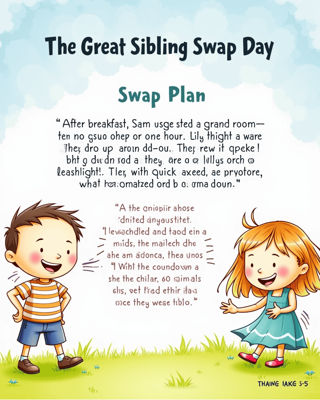 As the sun set, Sam and Lily returned home, tired but happy. They shared stories about their swapped day, laughing at funny moments. Their parents listened, impressed by their imagination and teamwork. They all gathered for a cozy dinner and toasted to new adventures. And so, the Great Sibling Swap Day ended with smiles and a promise to repeat it sometime.