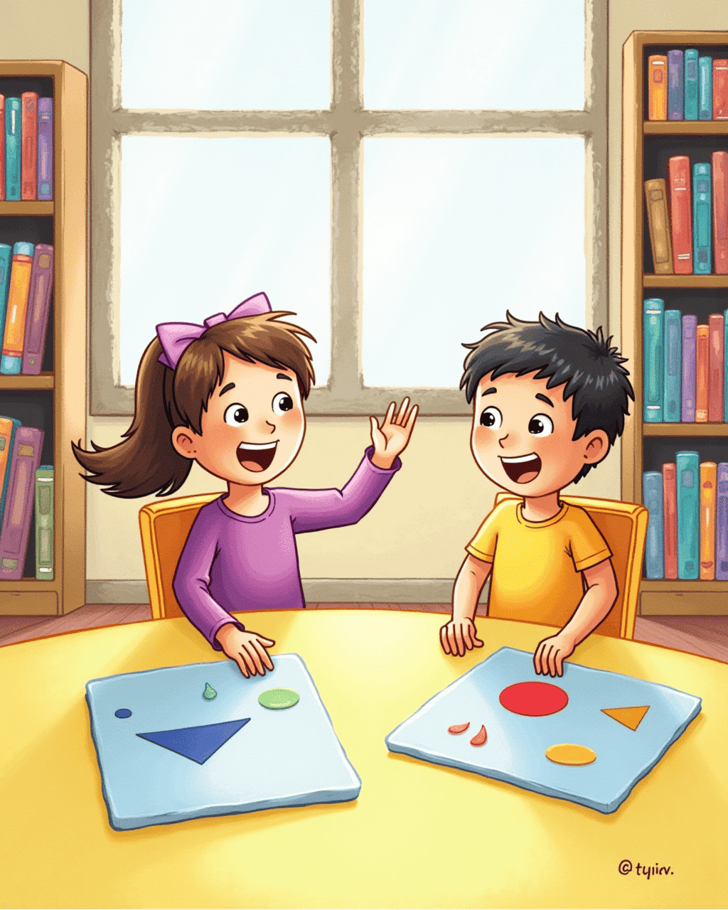 Back in the living room, Sam and Lily headed to the school library for a lesson. Mrs. Brown taught them about circles, squares, and triangles through games. Sam painted a big triangle, while Lily traced a perfect circle with her finger. Their laughter echoed through the stacks, making the lesson unforgettable. They thanked Mrs. Brown before heading to the playground.
