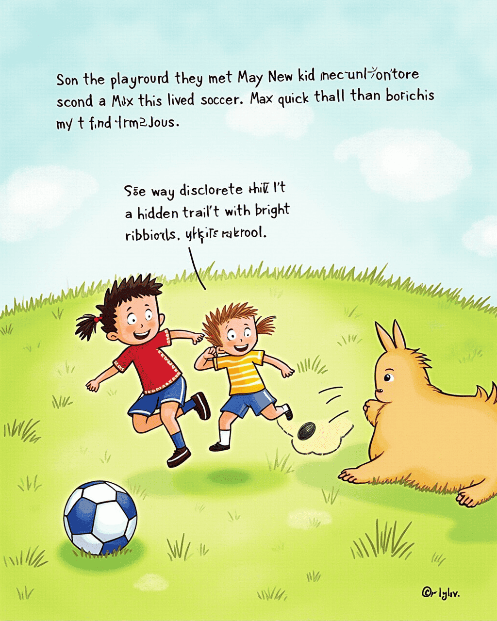 At the playground, they met Max, the new kid who loved soccer. Max showed them a special red ball that bounced higher than any other. They played a quick game of catch, and Max invited them to a secret hill behind the school. While climbing, they discovered a hidden trail with bright ribbons. The kids felt like explorers and promised to meet again.