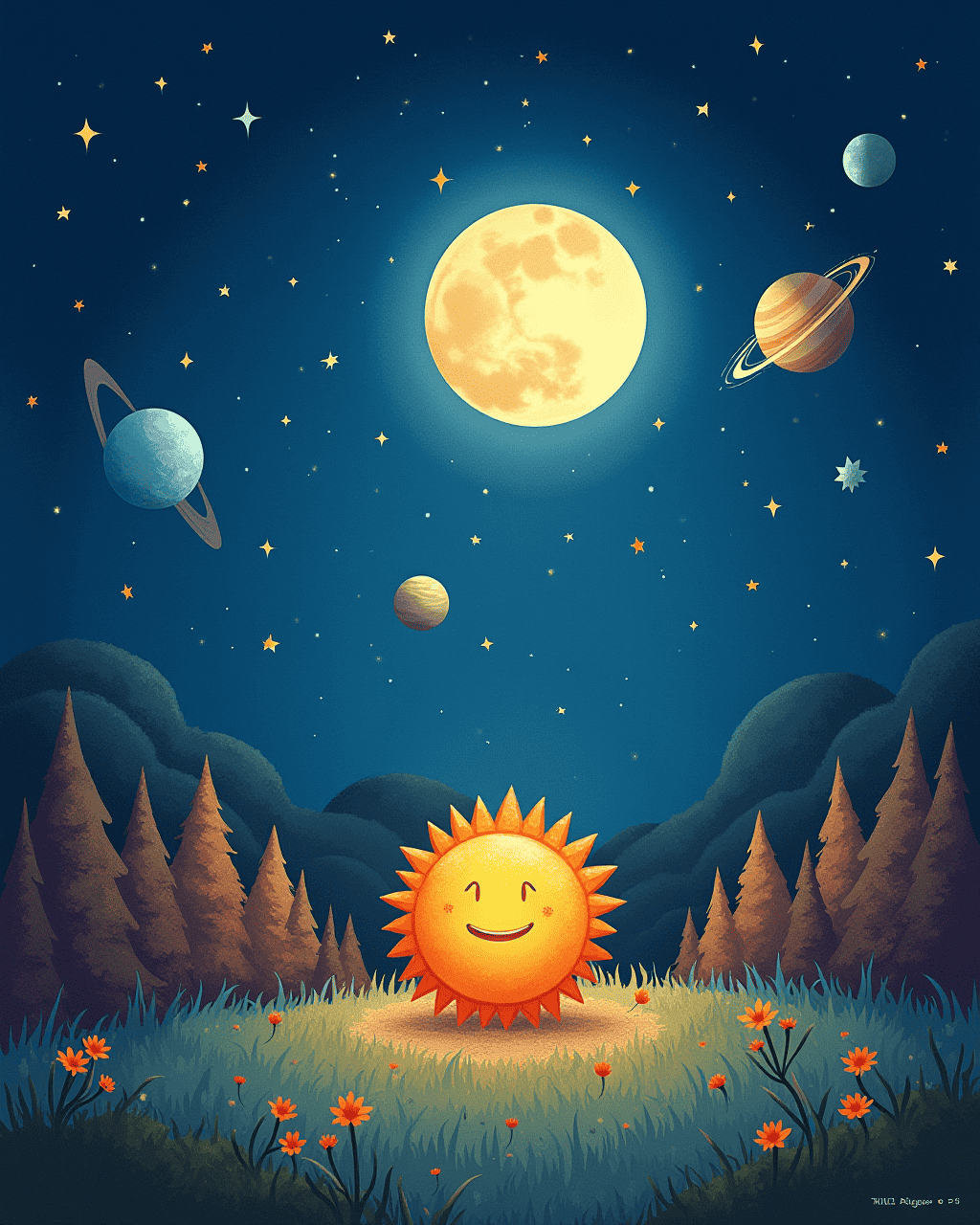 The Solar System Talent Show began under the twinkling lights of the Milky Way. The Sun blew out a roaring applause, shaking its rays and setting the stage for the grand event. It invited all the planets to bring their best tricks to the moonlit sky. Everyone was excited, from the bustling asteroids to the shy dwarf planet, Ceres. Even distant comets peeked through their tails, eager to hear the first notes of music.