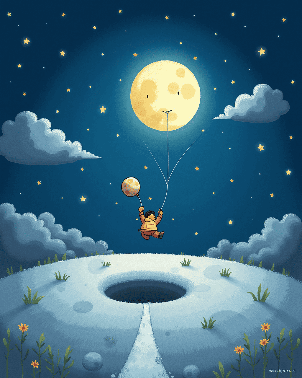 Spot feels a wind swirling around. Spot pushes the wristwatch to the sky. Spot glides onto the silver moon surface. Spot meets silver clouds that look like cotton candy. Spot sees a quiet path leading to a big crater.
