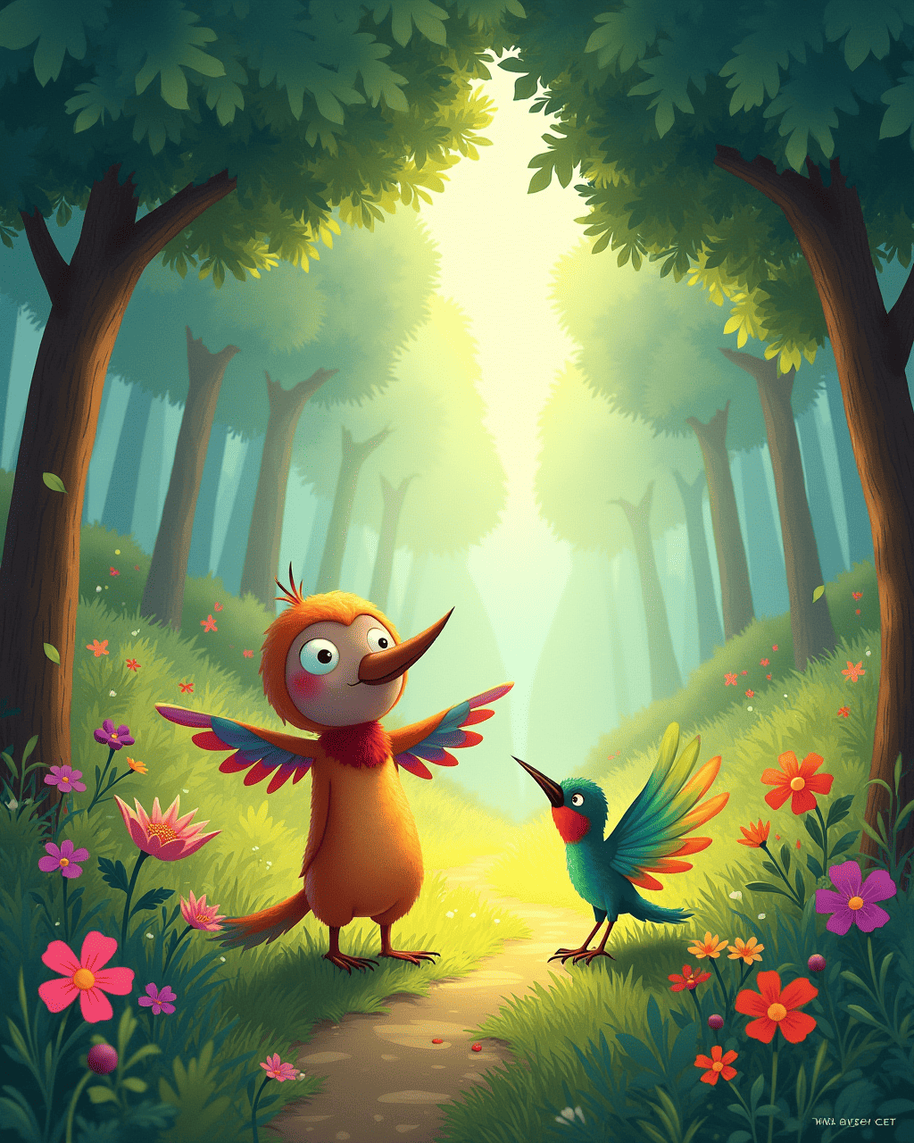 Next, Spot travels through a space tunnel made of light. Spot lands in a magical rainbow forest. The trees glow with all six colors. Spot befriends a hummingbird named Hue. They sing a song that lights up the stars.