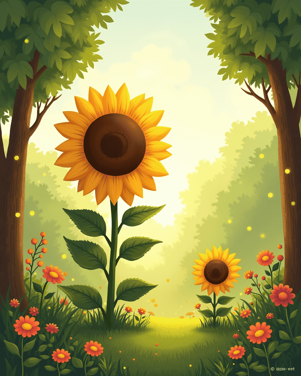 In the forest Spot meets the Giant Sunflower. The sunflower is twelve feet tall and tall. It speaks in a gentle voice. The sunflower gives Spot a sweet, golden seed. Spot promises to return the favor.