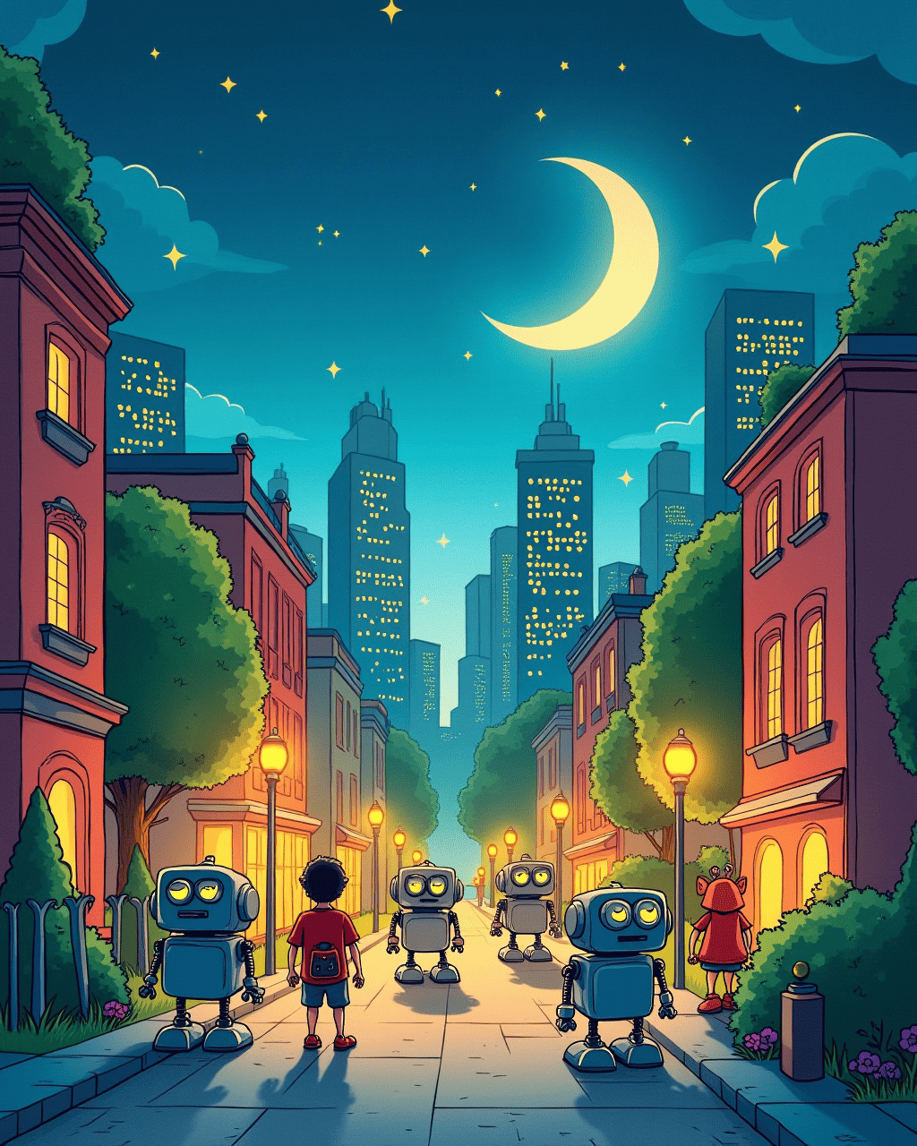 While Milo slept, the city’s lights dimmed. All the toy robots gathered at the park, looking tired and waiting for help. The mayor’s call for rescue seemed like a distant shout. Milo’s sleeping shoes whispered across the town square. Children painted bright murals of stars to brighten the shadows.