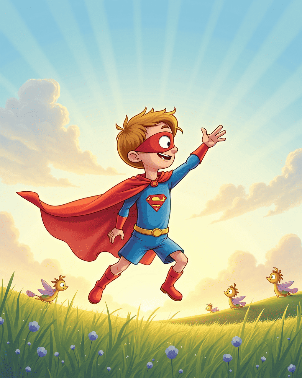 Milo blinked, stretched, and discovered the sky was already painted with sunrise colors. In the rush, he forgot his cape, his mask, and the mission was delayed. His friends, the playful pixies, tried to cheer him up. With each giggle, Milo remembered his secret strength: he could save everyone, even out of an ordinary day.