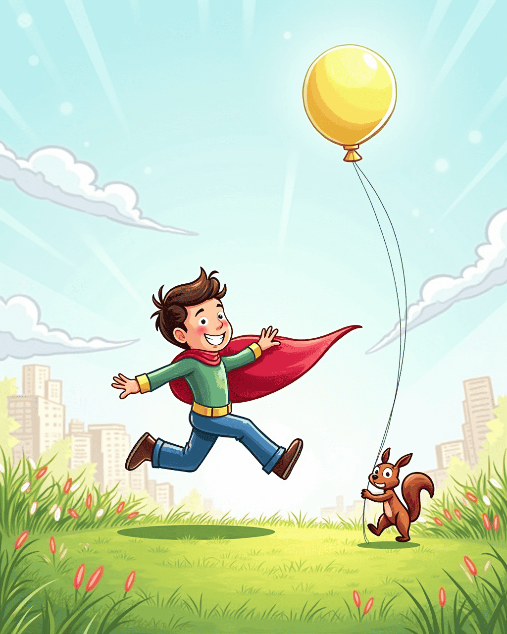 Suddenly, a big balloon floated away from the park. Milo rushed with his super speed, catching it just in time. He laughed and ran through the streets, bringing the balloon back for the children. Each step made the city smile again. Milo thanked the little squirrel for waking him, and they shared a candy cup.