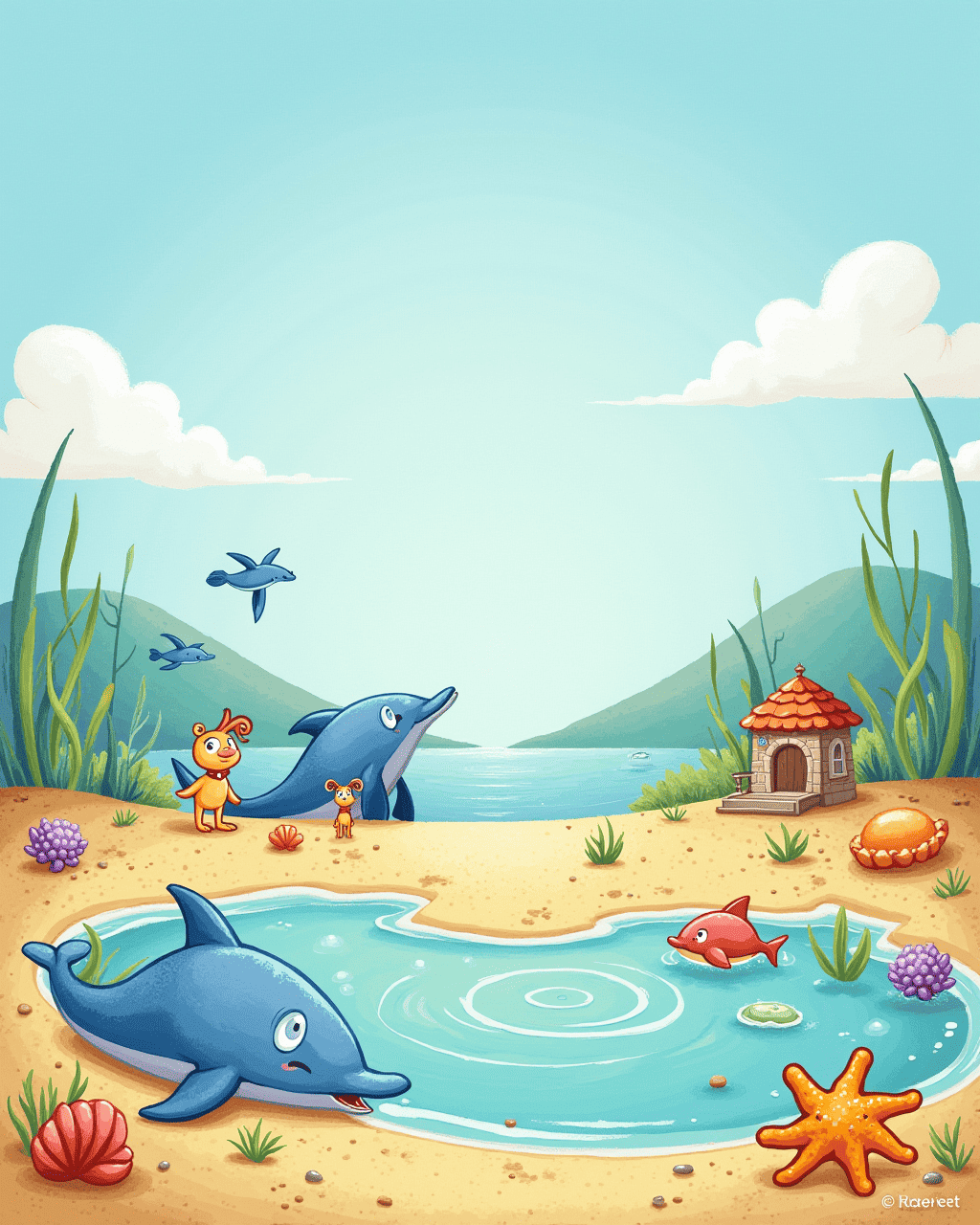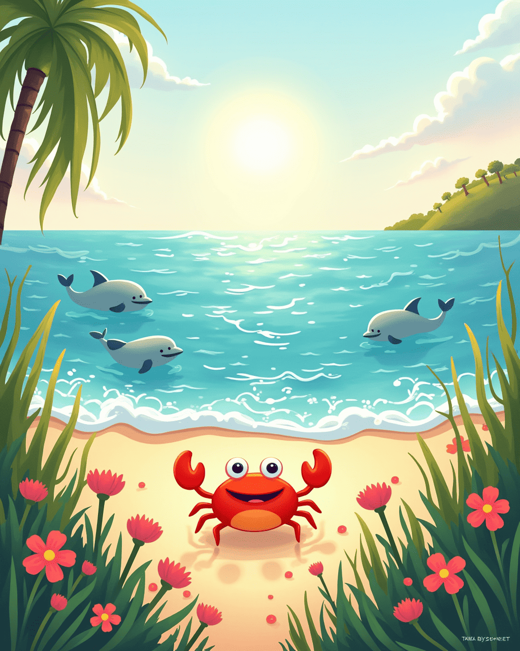 When the sunrise painted the horizon pink, a gentle wave rolled onto the sandy shore. Curious little dolphins swam in circles, greeting all with playful clicks. On the beach, a tiny crab named Coco clinked its shells like a tiny percussion band. The waves sang a lullaby that echoed through the seaweed garden. As the tide rose, Coco felt a friendly tug and followed it into the shimmering water.