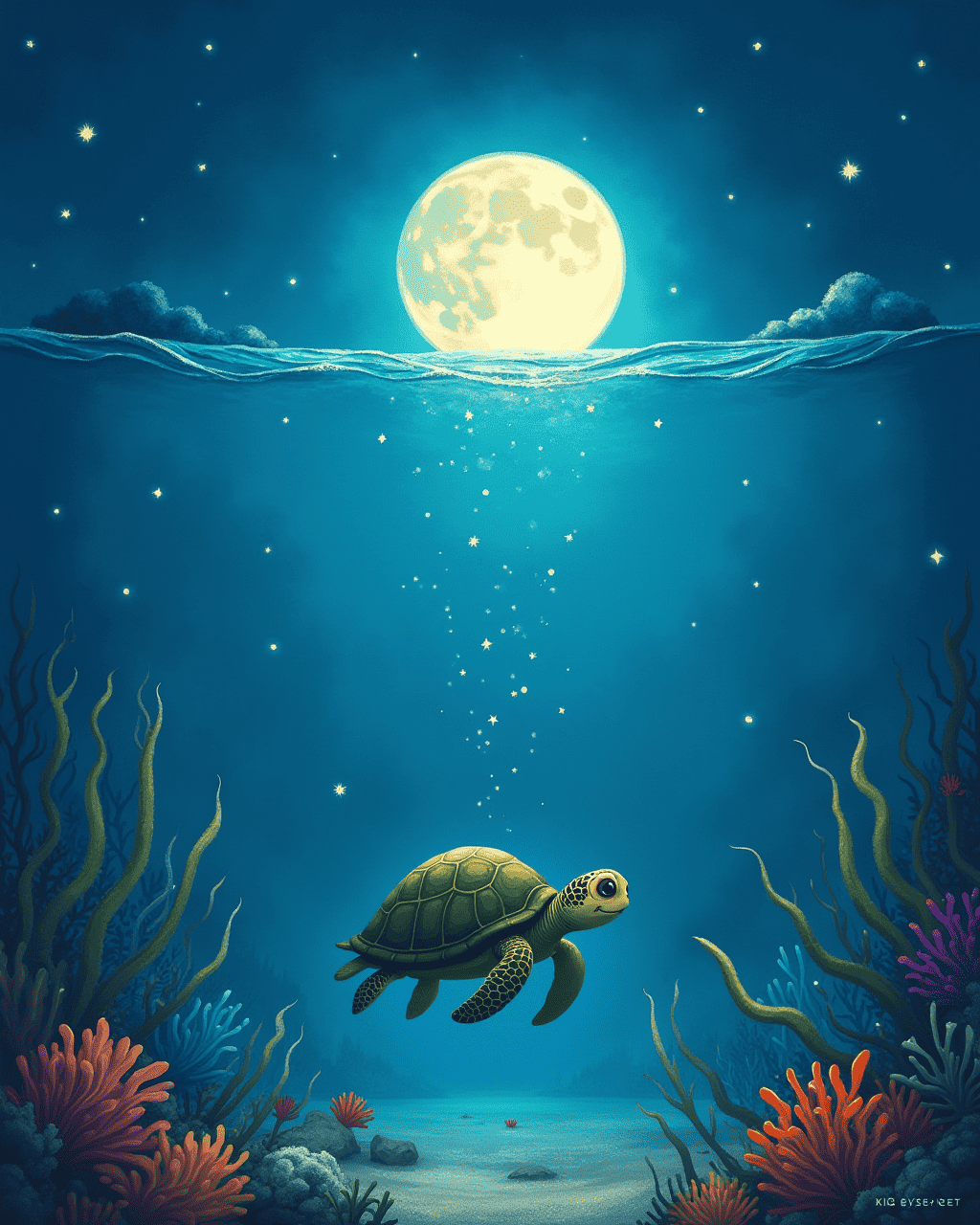 Deep beneath the sparkling water, Sir Tides the ancient turtle glided with wisdom. He told the children of the sea about the secret lagoon hidden beneath the coral. A brave sparrow fish named Finn wanted to meet the legendary turtle. Through currents and whirlpools, Finn chased the ancient guardian. At last, Sir Tides welcomed Finn, sharing stories of starfish guardians from the midnight depths.