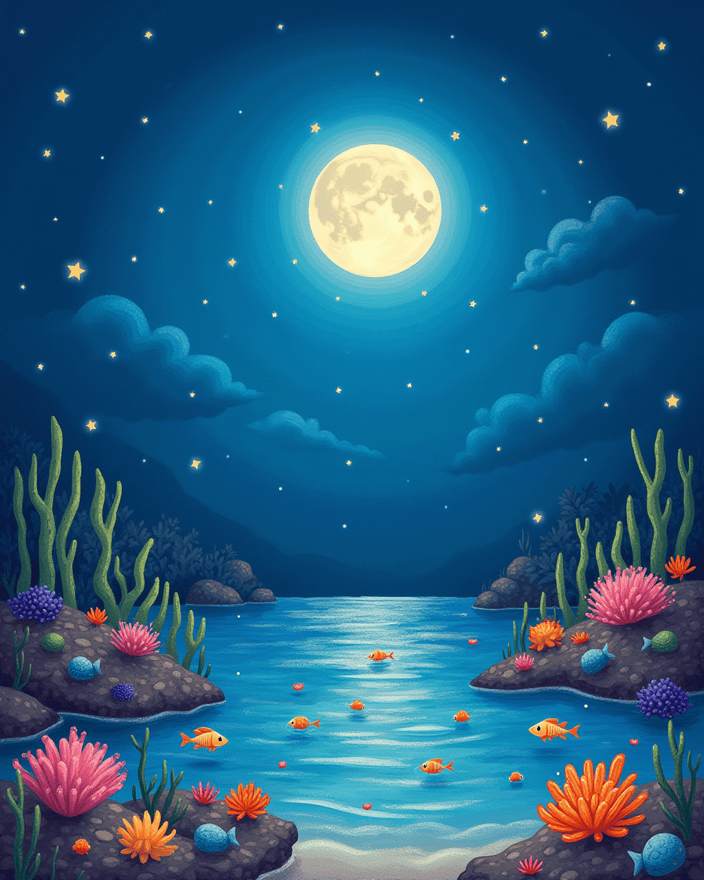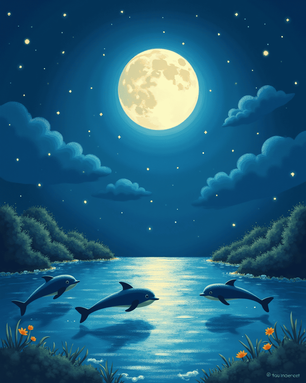 The next morning, the moon reflected its silver glow on the water. All little fish joined hands for a shimmering celebration. They formed circles that shimmered with moonlit stardust. The dolphins leaped like silver moons. They shared stories that twinkled as brightly as the moon above.