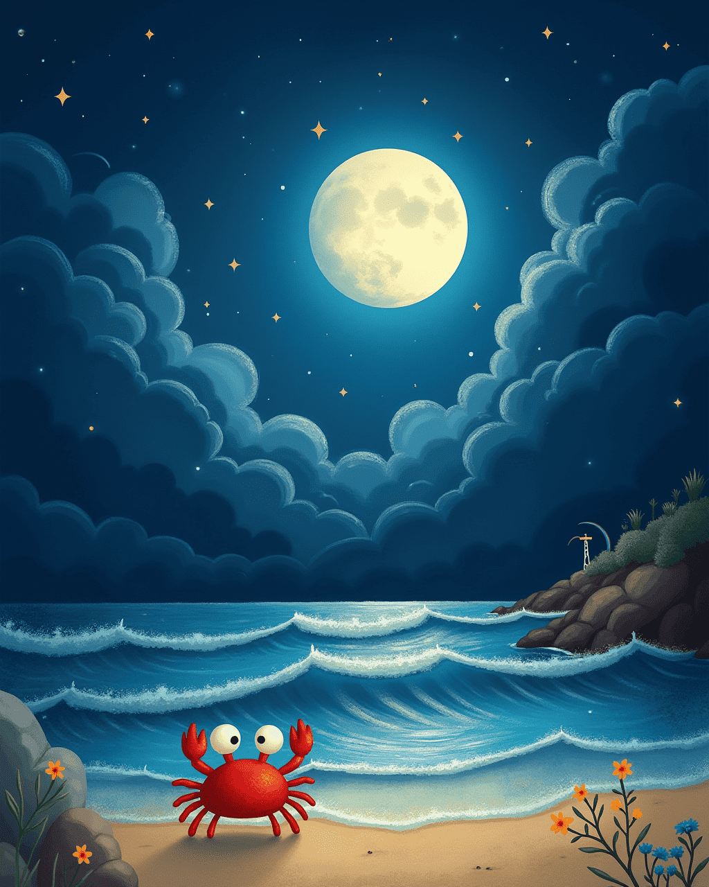 In the moonlit night, black clouds gathered in the sea sky. A mighty thunderstorm roared, shaking the waves and the sand. The brave little crab tried to find shelter in a coral cave. Sir Tides guided him through the storm, a shining lighthouse in the dark. When the storm passed, a rainbow arced across the horizon, bringing hope to all.