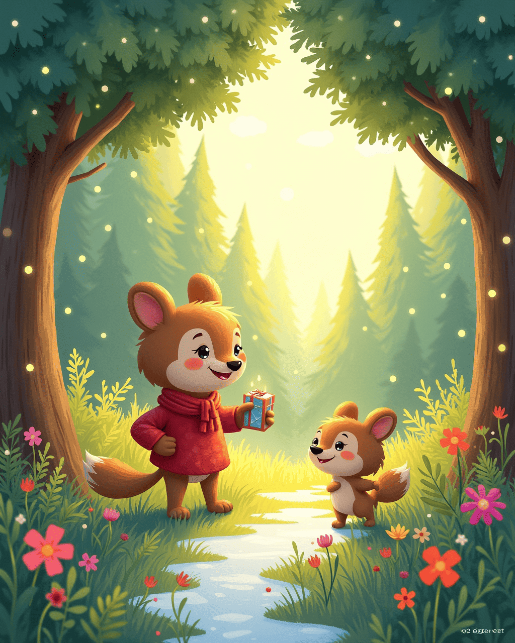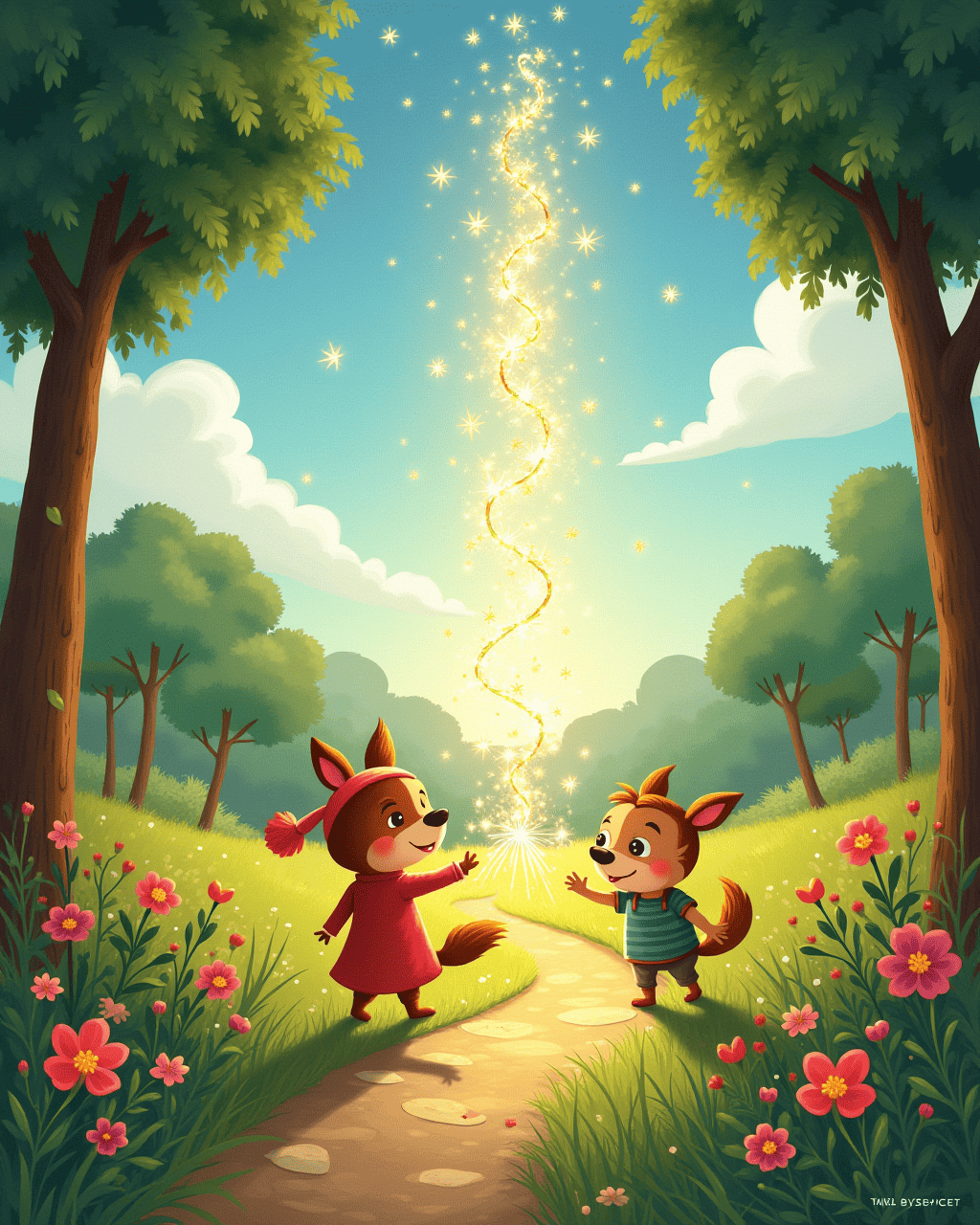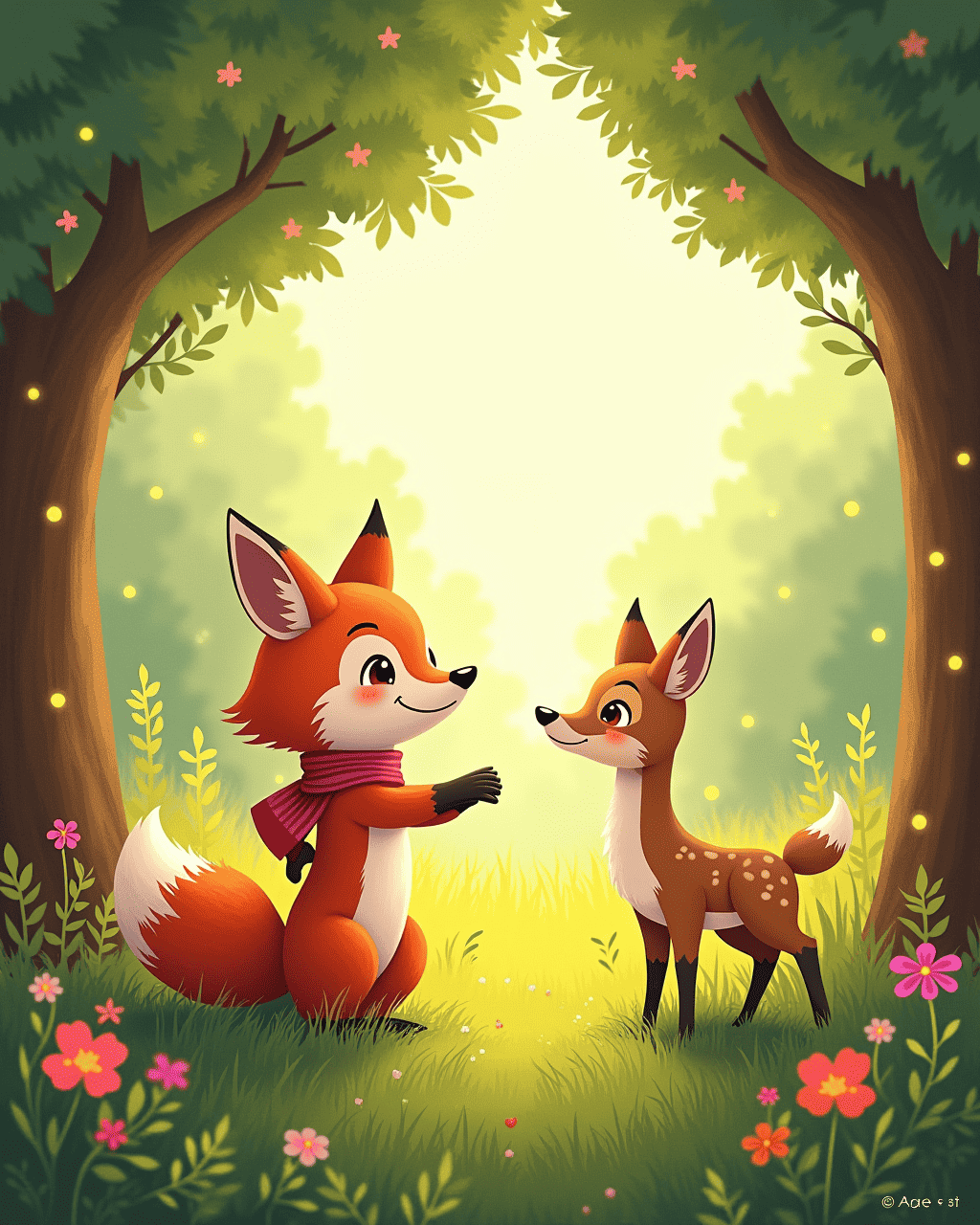 Soon, a clever fox named Finn, and a brave deer named Dax teamed up to rescue Twinkle. They guided her back to the high pine with strong vines. Together, they secured Twinkle with a fresh golden thread, restoring her shine. The forest animals applauded, and Twinkle felt her sparkle grow like a sunrise. The feeling of unity warmed Twinkle’s tiny heart.