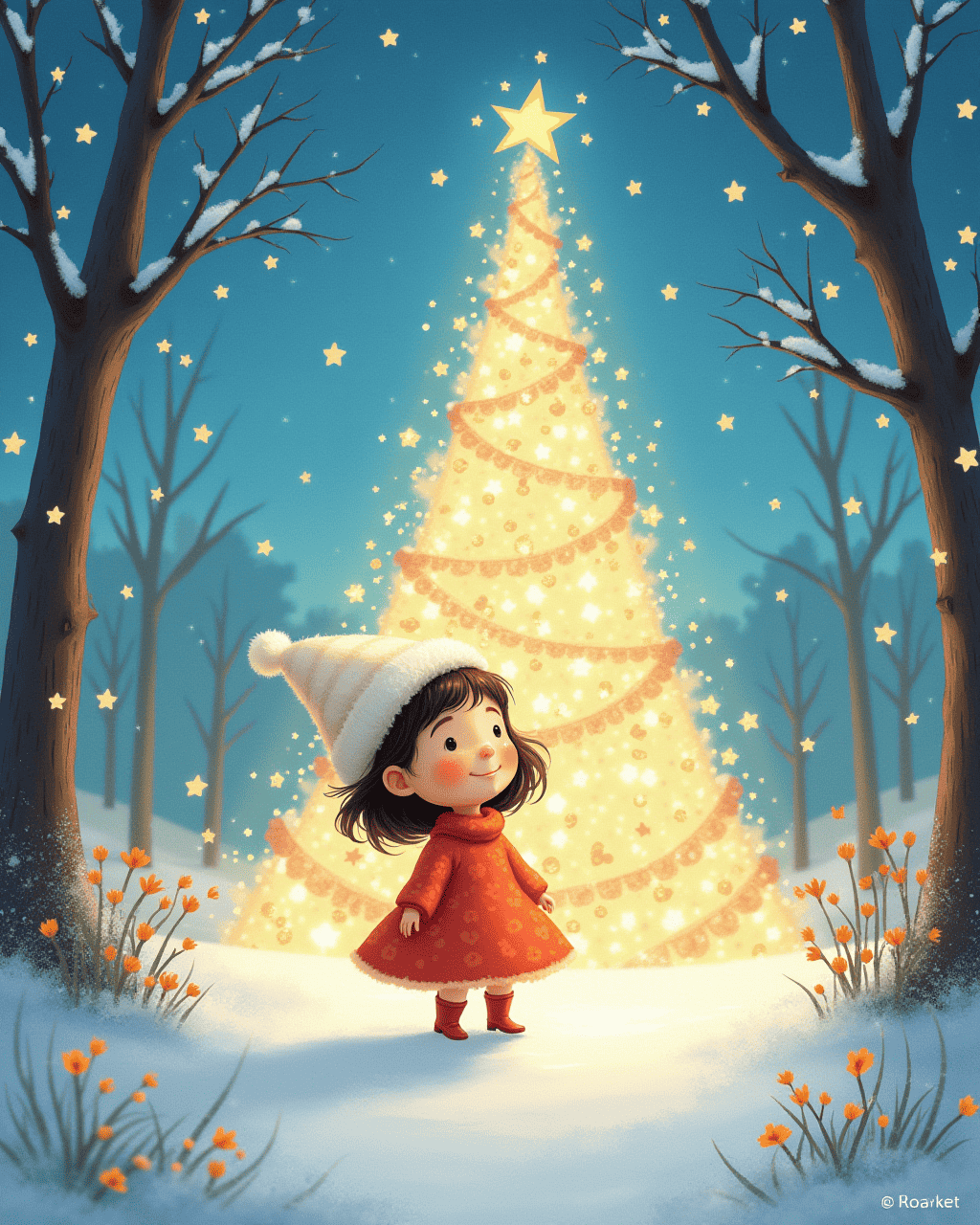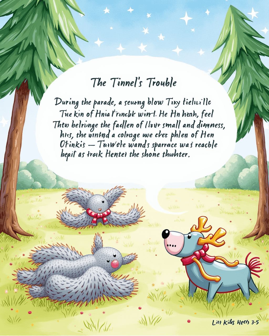 The first light of the day cast a warm glow across the snowy forest. In a cozy little cabin, a tiny tinsel named Twinkle was eager for adventure. Twinkle hung proudly from a pine tree, twinkling brighter than the stars in the night sky. The forest animals gathered, sharing stories about the magic of sparkling decorations. They all cheered when Twinkle found a silver leaf that sparkled like a tiny star.