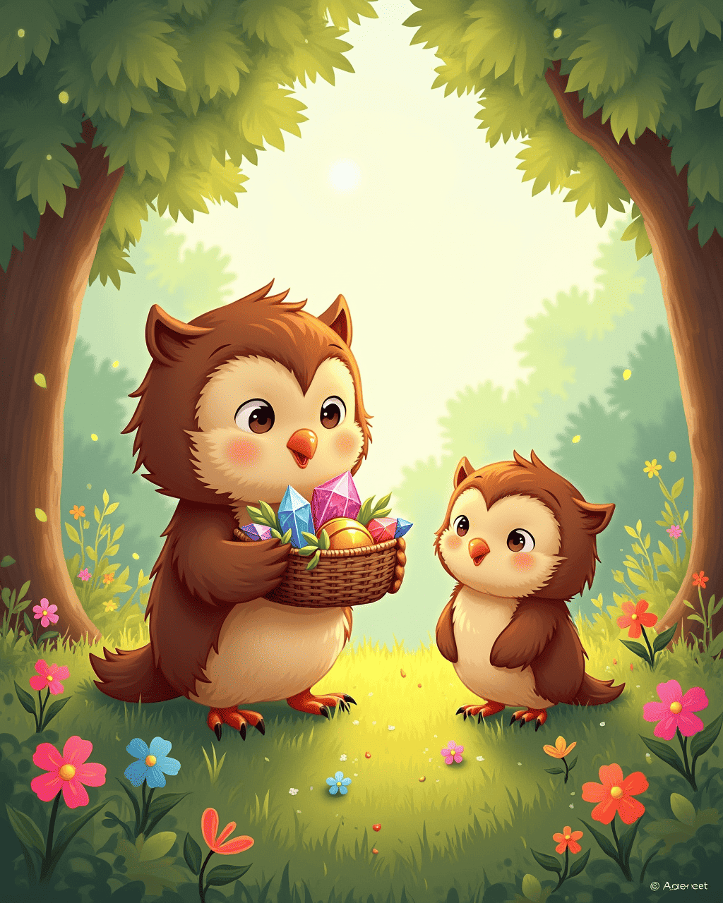 While the forest prepared for the big holiday festival, a kindly old owl named Oliver offered a sparkling gift basket. The basket contained twinkling crystals and a shiny bell. Twinkle was delighted, feeling her heart pulse with excitement. Oliver explained that true sparkle comes from sharing joy with friends. Twinkle thanked him, feeling braver and more radiant.