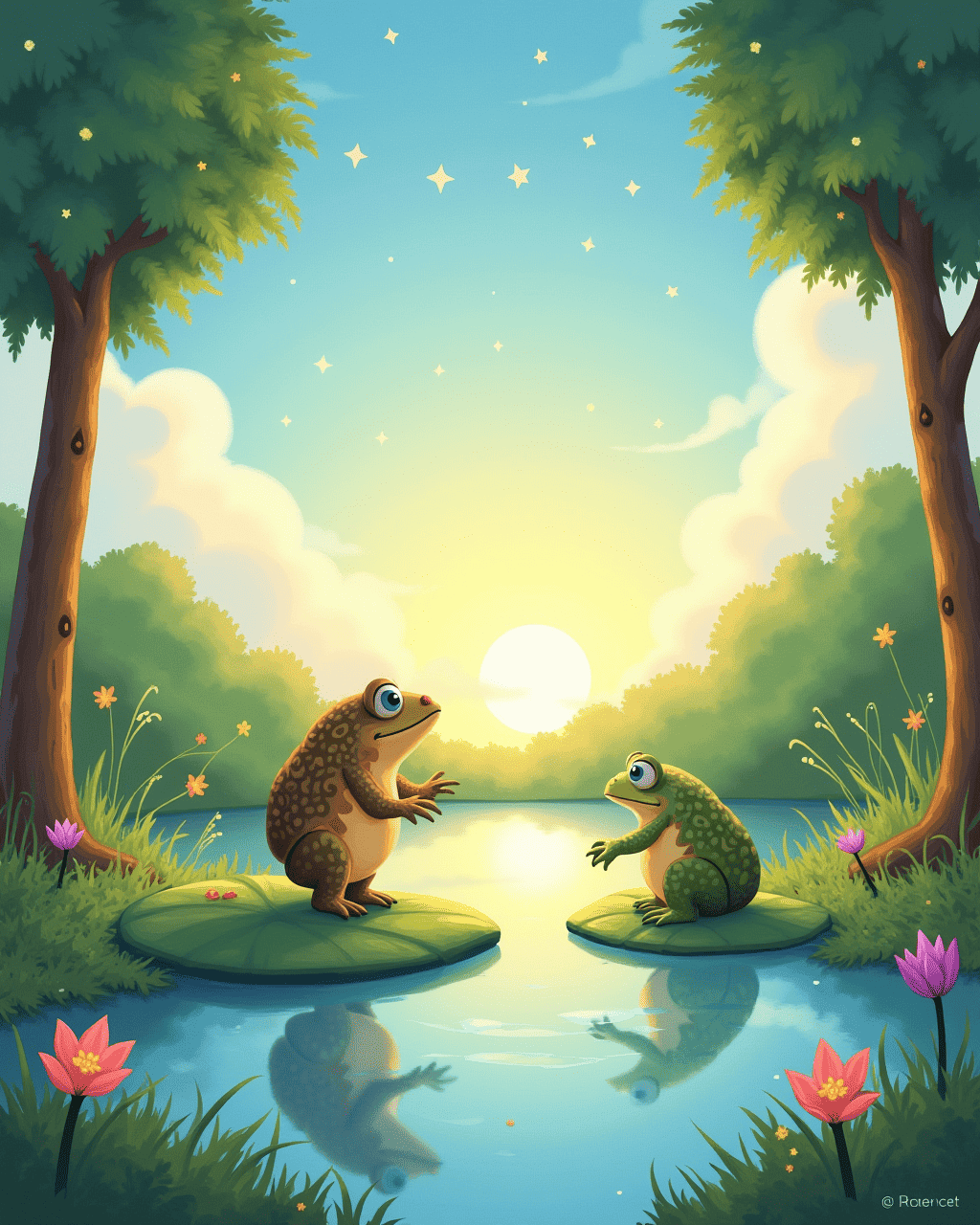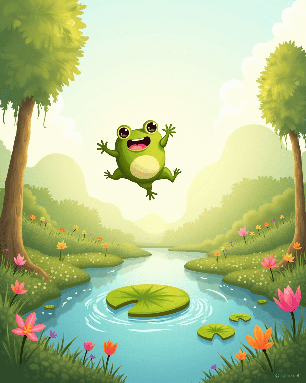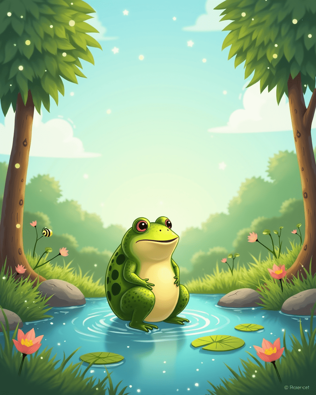 When the morning dew sparkled on the leaves, the tiny toad named Tilly awoke with a big dream. She wanted to see the world beyond the pond, but she was too small to swim too far. With her shiny green skin, she looked around at the lily pads and the buzzing bees. She imagined herself hopping to distant hills and meeting new friends. Her heart beat fast with excitement as she decided that today would be the day of her adventure.