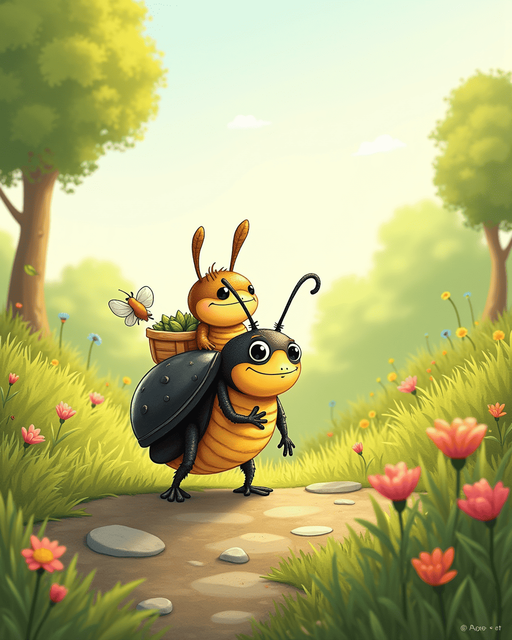 Tilly wandered further, and soon she met a beetle named Benny. Benny had a shiny black shell and carried a little basket filled with crunchy leaves. He welcomed Tilly with a friendly chirp and offered her a ride to the orchard. The toad clung to Benny's back, feeling safe as they travelled over stone paths. They laughed at the dancing dandelions and shared stories of their homes.